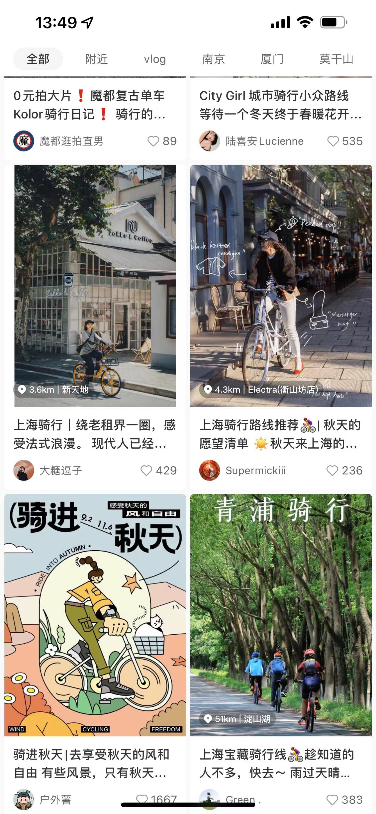 在小红书上,搜索“骑行”这一关键词,累计出现超136万篇笔记。有关“自行车”的笔记超过142万篇,其中不乏骑行攻略、骑行打卡、自行车购买、骑行装备推荐等热门内容。抖音里与自行车相关的话题视频,播放量高达75亿次。