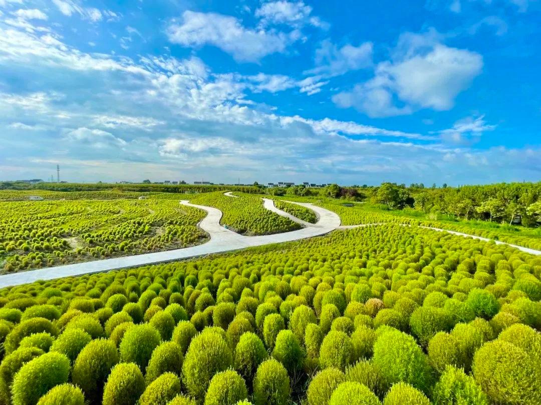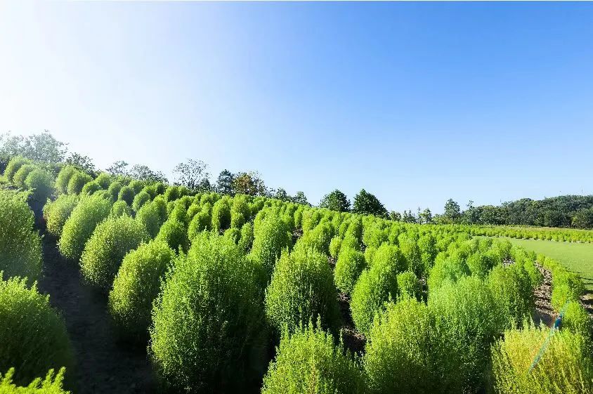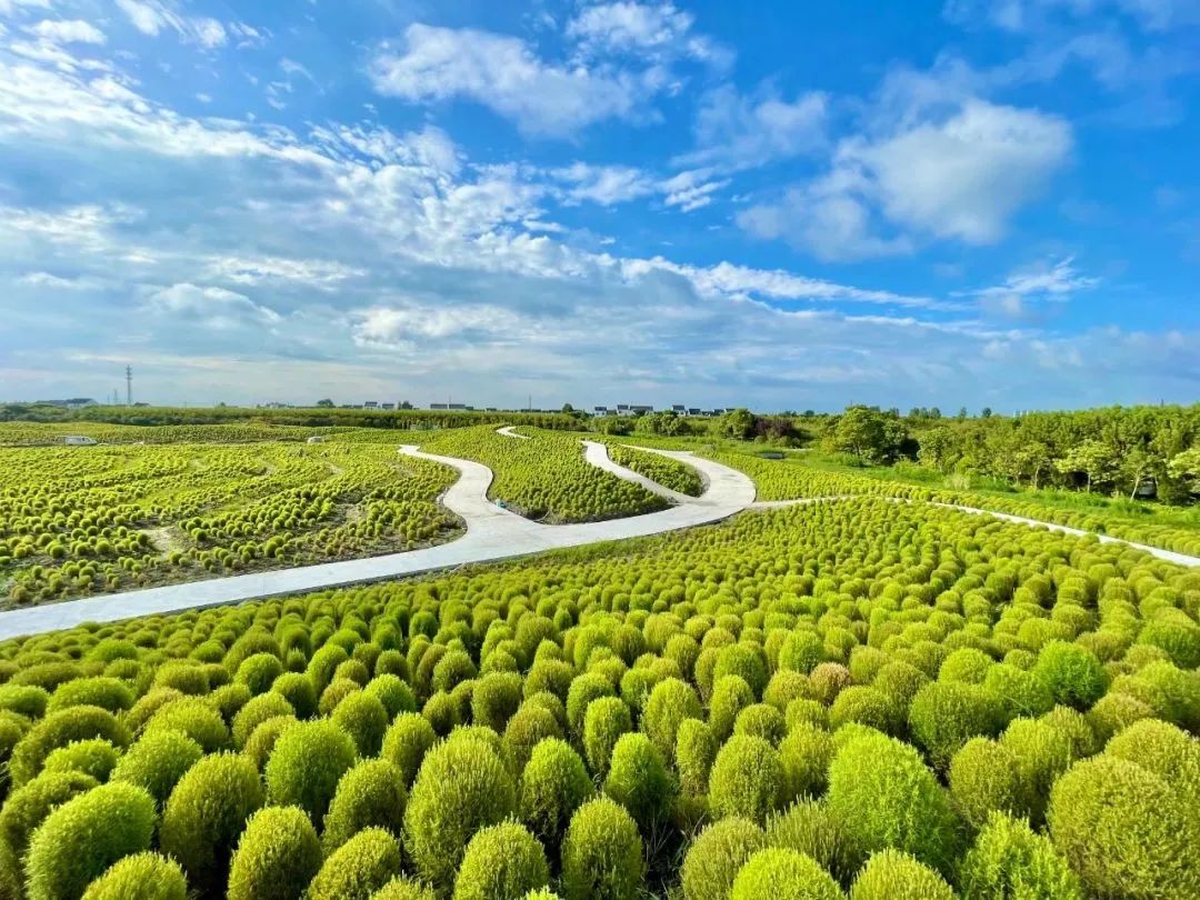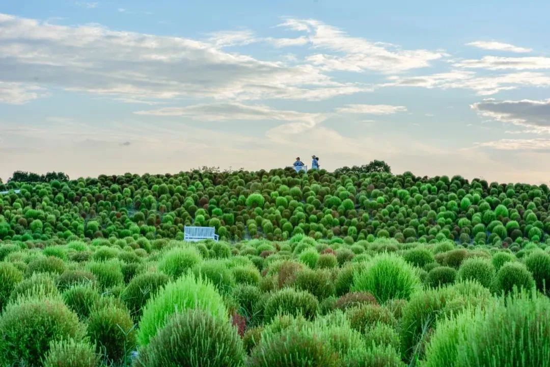 提起地肤,自然会想起花开海上生态园这座“毛球王国”。花开海上生态园种植了上万株的大片地肤。软萌可爱的地肤在绿色的最佳观赏期,与红叶期是迥然不同的风格。
