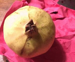 2.然后用刀顺着石榴的外部白筋在外皮划几刀,轻轻划掉果实白色的内心部分;