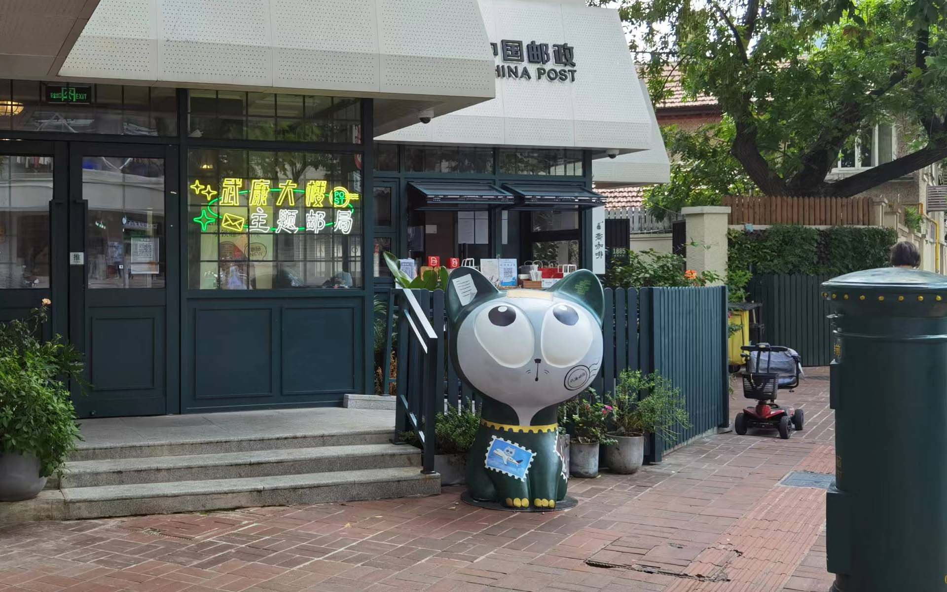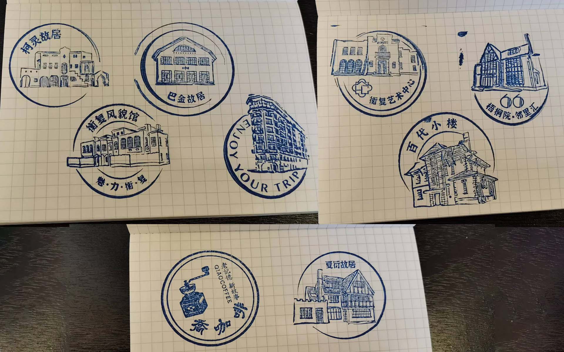 回头间,发现武康大楼主题邮局在背后,深绿色的复兴猫赫然就在门口。这里不光可以购买武康大楼的周边产品,也可以积累纪念章。“章在墙上的倒数第二排。”工作人员提醒道,定睛一看发现,墙上用木块拼出的武康大楼图样,倒数第二排的木块都可以取下,整个系列的印章共有9种样式。两位来自河南的游客正挑选着自己喜爱的明信片,并且购买了邮票准备寄回家中。