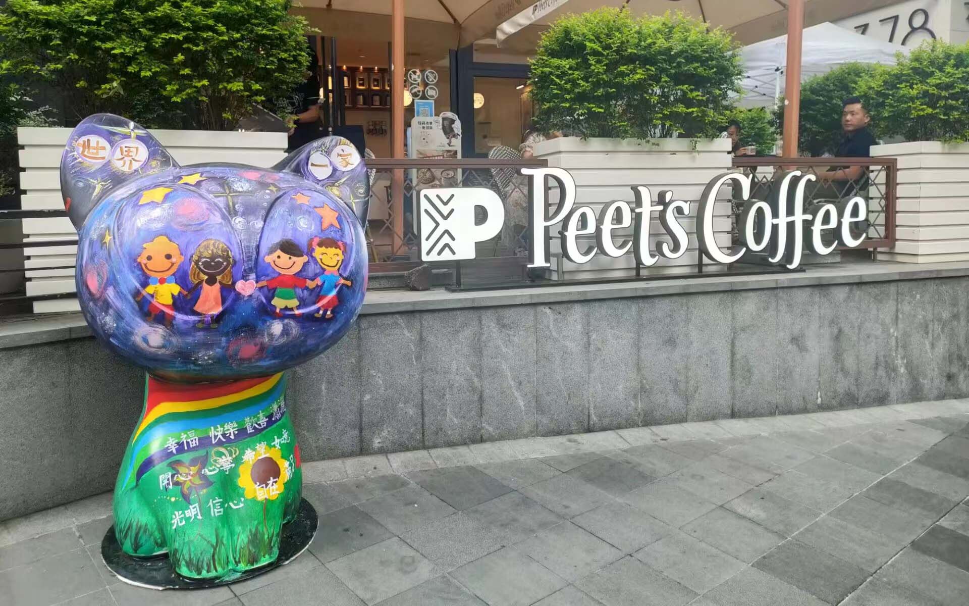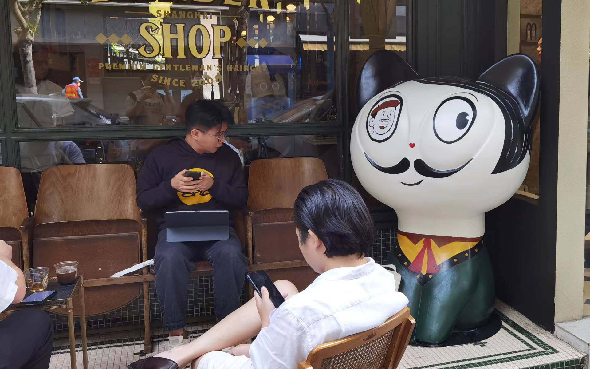 散落在衡复各处的复兴猫,表现着不同店家的风格。漫步街头,就算不特意寻找,他们也能给人带来不错的惊喜。Pulsone Coffee在衡复地区的两家门店门口都有复兴猫,一只头戴碎花头套、闪片墨镜,好不时髦;一只穿着蓝色睡衣,酣然入睡。店里的咖啡命名也很有创意,一杯绿码(抹茶)拿铁畅行上海。