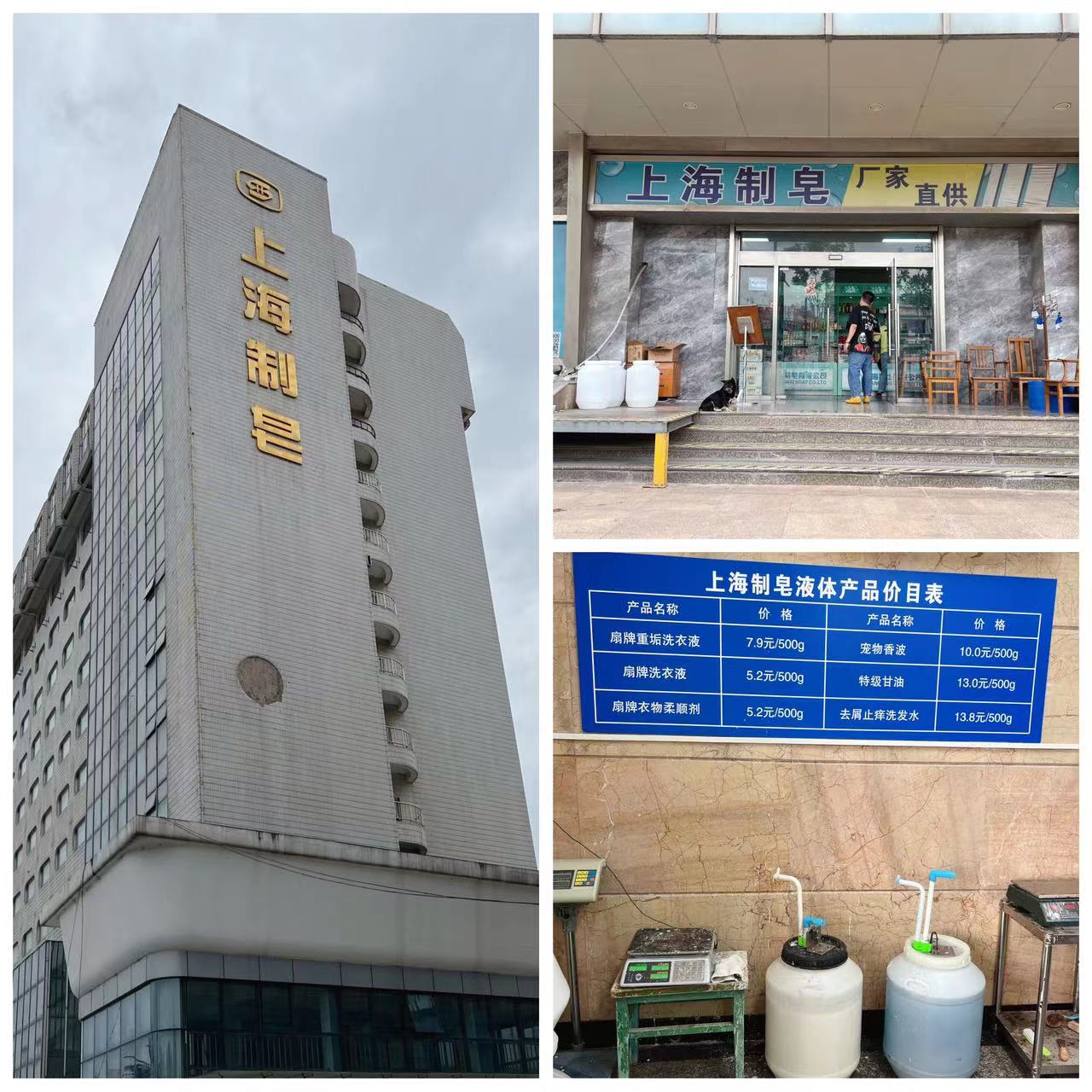 过杨浦大桥继续往东骑,位于杨树浦路上的上海制皂有限公司门市部,依旧保持着“零拷”的售卖方式。走进店里,可以看到墙上贴着醒目的价目表,重垢洗衣液7.9元一斤,扇牌洗衣液5.2元一斤……实惠的价格吸引不少顾客慕名而来。