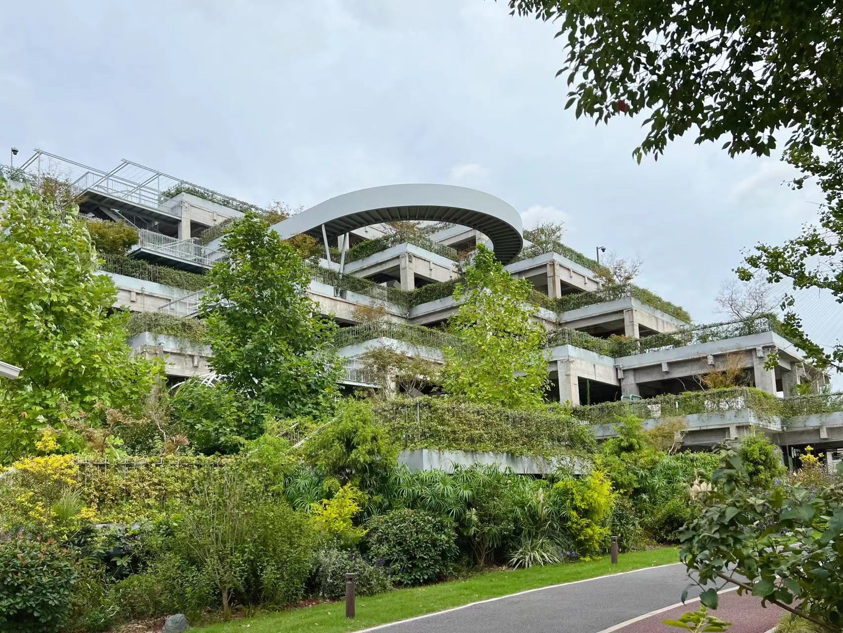 一路骑骑停停行至杨浦大桥下,你会看到一座楼梯环绕的建筑,还种了许多花草,远远眺望就像一座“古巴比伦空中花园”。这栋建筑也有自己的名字,叫“绿之丘”,前身是一个烟草仓库,如今是“滨江第一网红”,可惜最近在维修不对外开放。