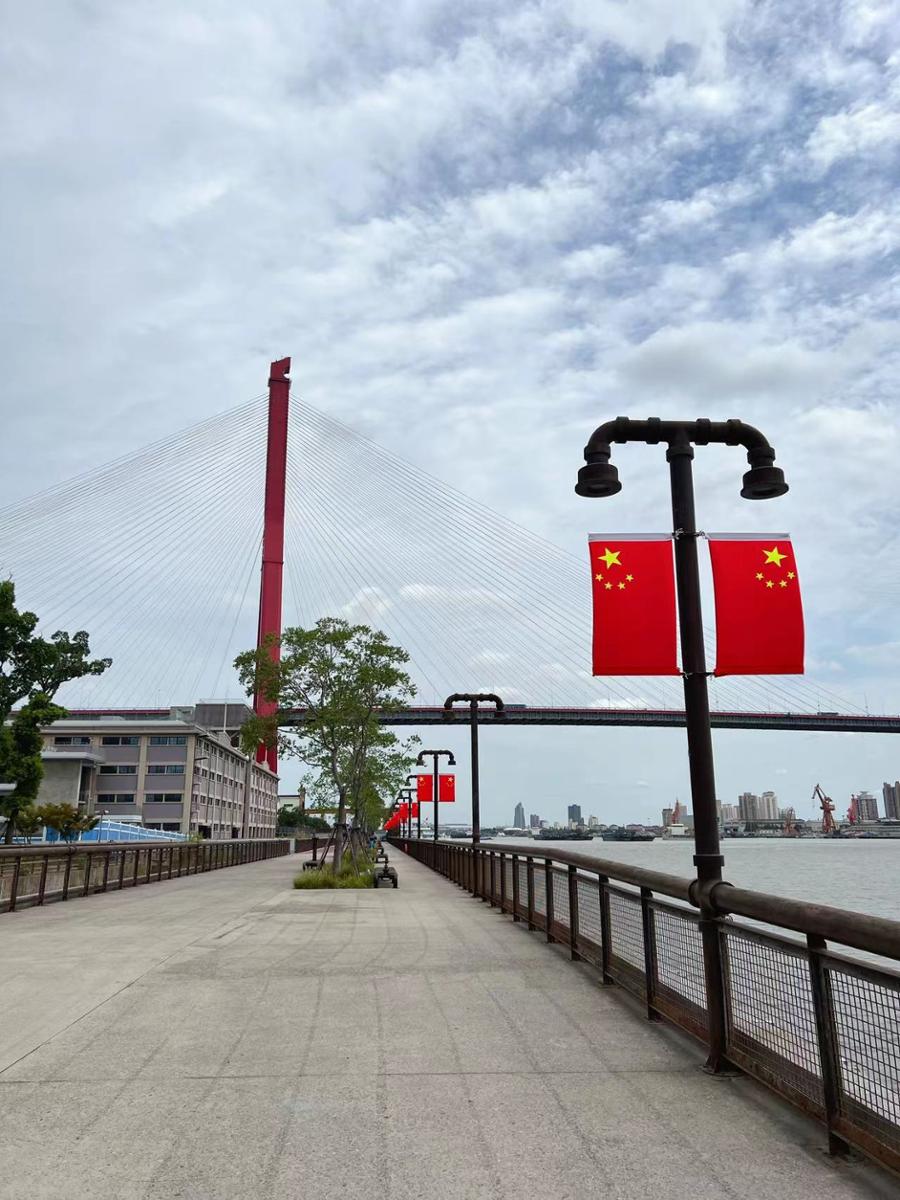 路过杨浦大桥,简约的红色线条横跨黄浦江,甚为壮观,在国旗的映衬下,更是夺目。白天万里无云的时候,用略仰的视角拍摄,将大桥与江水、城市建筑、桥下的粉黛乱子草、湛蓝天空相融,风光无限好,晚上景观灯一亮,又是另一番绚丽夺目。