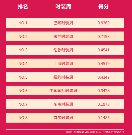 “全球时尚产业指数·时装周活力指数”由中国经济信息社编制,至今已发布4期,从要素聚集度、媒体传播度、行业影响度三个维度构建评价模型,衡量全球主流时装周发展活力。最新一期指数结果显示,巴黎、米兰时装周领先优势依然稳固;伦敦、上海时装周紧随其后,纽约时装周降至第五位,中国国际时装周、东京时装周、首尔时装周分列六至八位。
