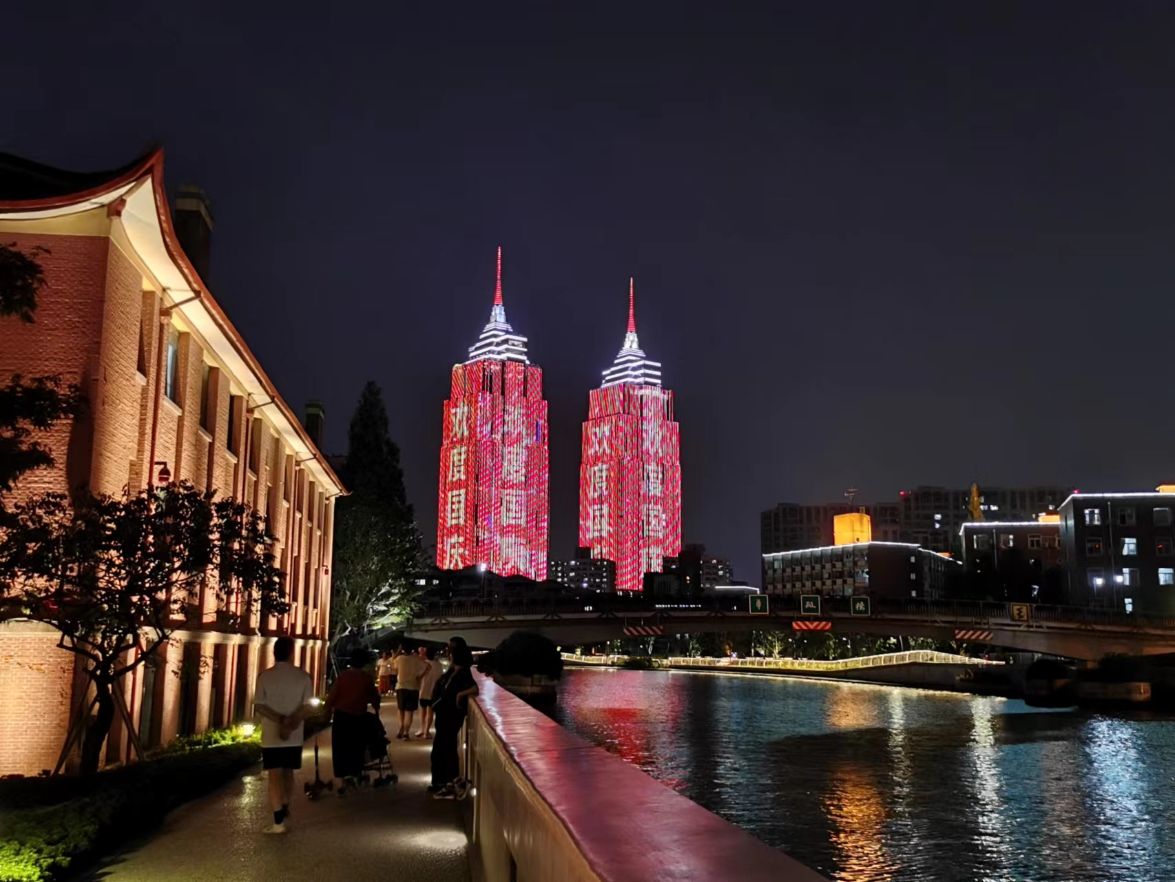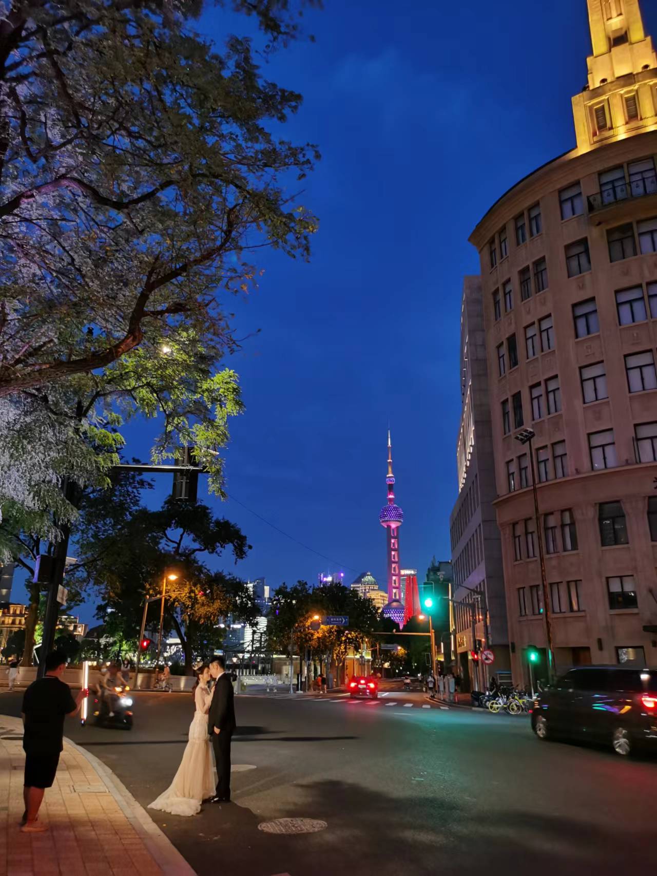 夜幕降临,苏州河畔也点亮了灯光。在万航渡路,华政古老建筑群隔着苏河与远处的环球港双子塔在绚丽的灯光中隔空相望,宛若古老与现代的对话;在昌化路,天安千树的点点星光倒映在苏河之中;而在乍浦路桥,几对新人以远处外白渡桥、陆家嘴的灯光为背景,记录他们的新婚瞬间,为这座城市留下了浪漫的气息。