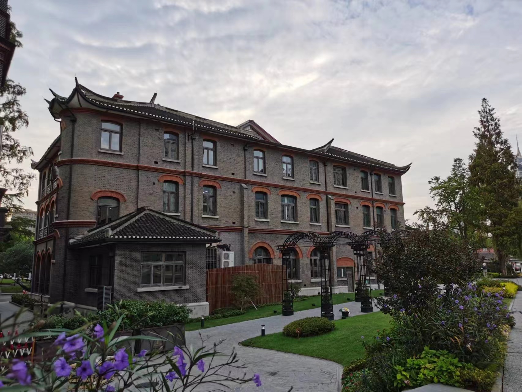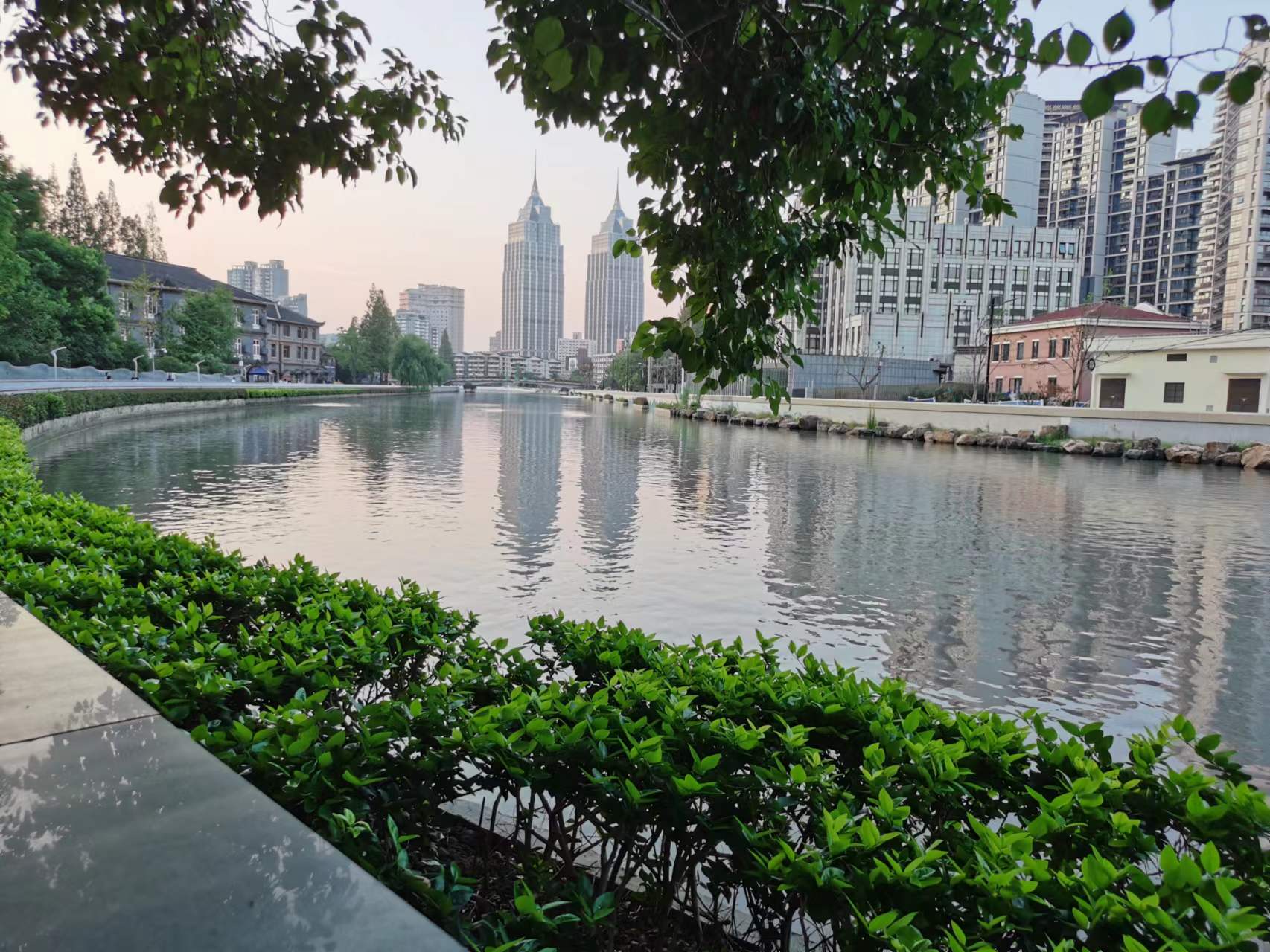 在华阳路,苏州河紧邻华政长宁校区的滨河空间给人的第一印象是开阔、敞亮、自然清新。沿河边的步道行走,一边是蜿蜒的苏州河,另一边是华政校园内古朴的建筑。华东政法大学长宁校区是上海圣约翰大学原址,古老的建筑群宛如上海城市的“活化石”,“国宝级”的历史建筑与苏州河交相辉映,诉说着上海的城市记忆。