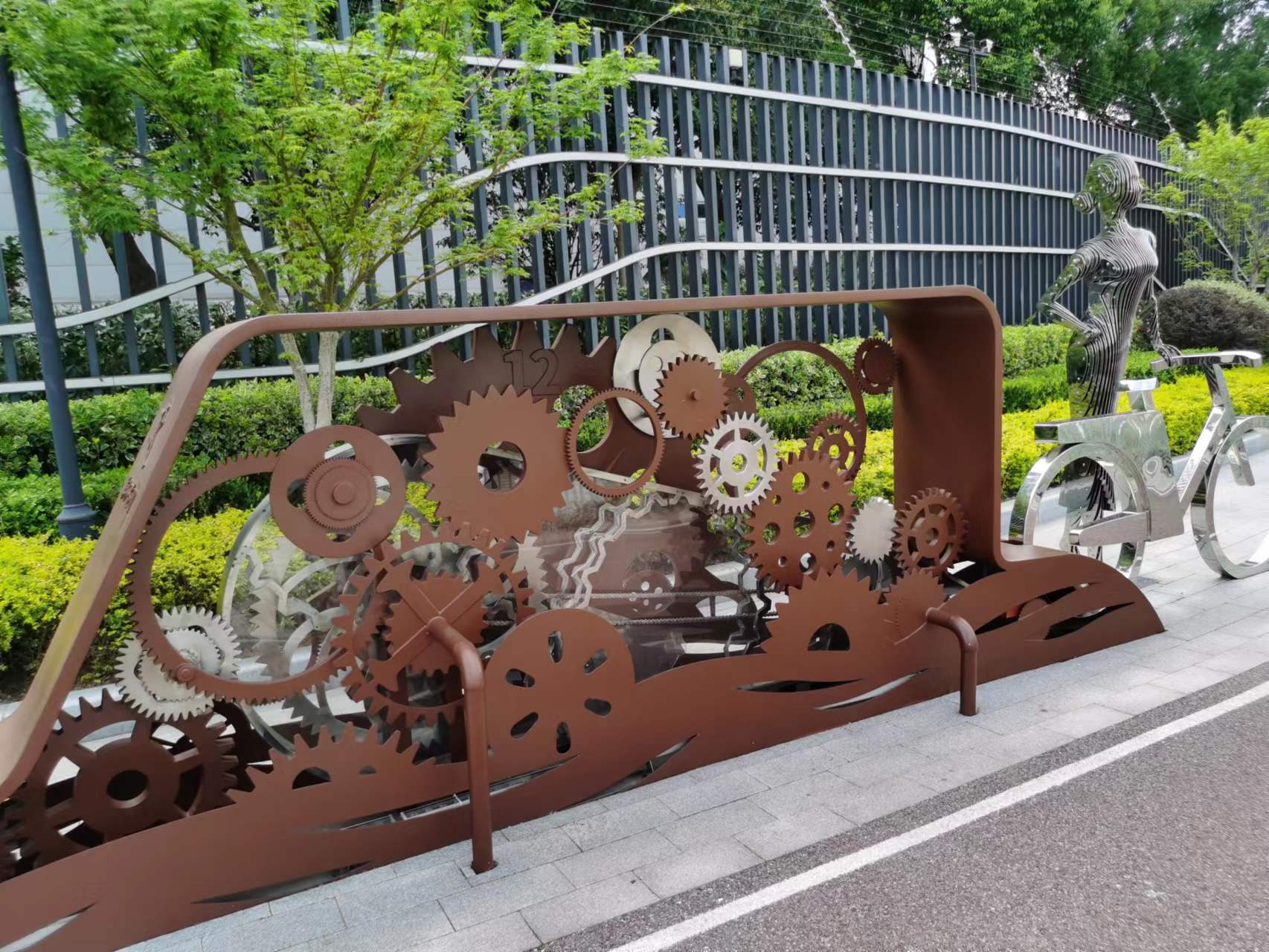 苏州河步道海烟物流段也吸引着游客驻足:“齿轮”状的雕塑和景观装置,名为《瞬间》的国棉二十一厂女工雕塑,以及融入了弄堂文化、沪语童谣、中山公园的落叶等元素的设计,“走在苏河步道既能欣赏到河畔的自然风光,又好像一场‘穿越之旅’,带我感受历史的厚重。”游客小秦说。