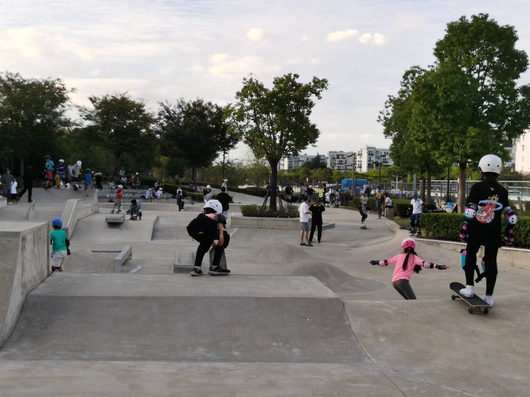 从江苏北路到外环线的苏州河段,健身步道将临空音乐公园、滑板公园、风铃绿地等10个公园绿地串联起来,形成了一条连接市井百态的城市项链。在滑板公园内,几位十来岁的少年正熟练地操控着滑板“飞”向空中,也有几位“初学者”在旁人的指导下,踩着滑板一点点挪动。小孙是一个滑板“爱好者”,她从虹口专门来到了滑板公园,“在这里玩累了还能到河边逛逛,周围的风景也非常‘出片’。”