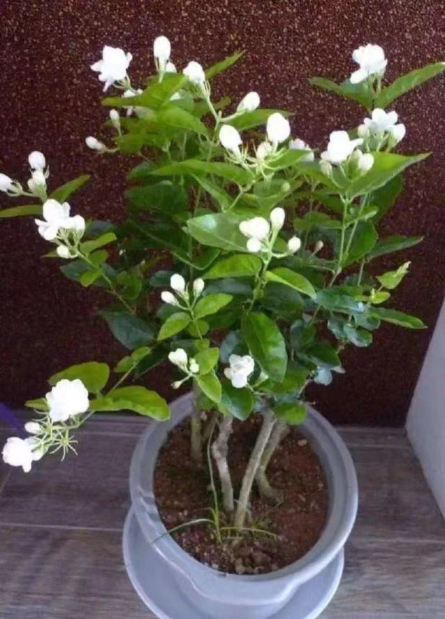 种植知识:茉莉花极喜肥,只要养护得当,盆栽茉莉一年可开三次花。9月上旬至10月上旬,浇水量要逐渐减少,由于天气已渐转凉,会影响花苞的形成,因而这批花的数量较少,至10月中旬以后开花结束,只需保持盆土略湿即可。