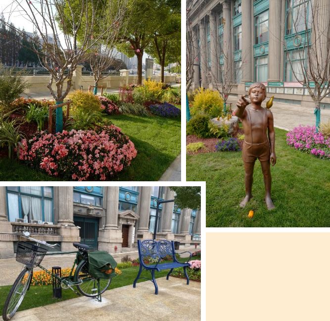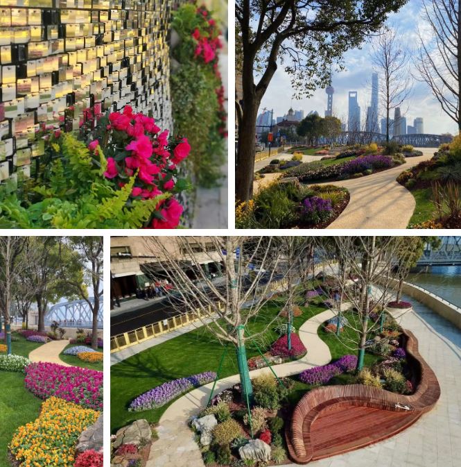苏州河虹口段滨河绿地以文化焕新为植入点,依托沿线上海大厦、邮政大楼等优秀历史建筑云集的丰富资源,把虹口苏州河沿岸街景绿化打造成“有意境、易亲近、可停留的客厅花园”,使用“蓝梦”“时光”“信使”“星空”四个各具特色的主题花园点缀其间,形成宜人的滨水游憩景观步道。