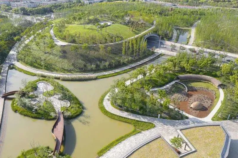 桃浦中央绿地公园是上海城区最大面积中央绿地公园,绿地地势北高南低,从北向南逐渐由北三块的自然休憩山谷林地过渡到南三块的绿色地下商业文化空间,而北拓区域则侧重营造在城市森林中融入青少年户外活动空间。