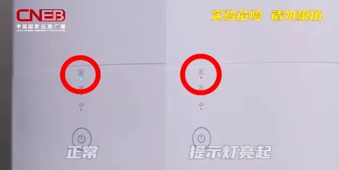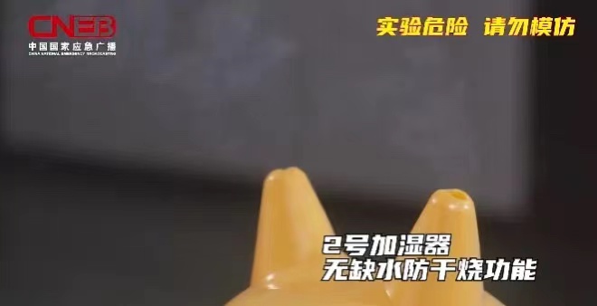 在无水的情况下,“缺水防干烧”加湿器停止工作,另一边,普通加湿器持续干烧。