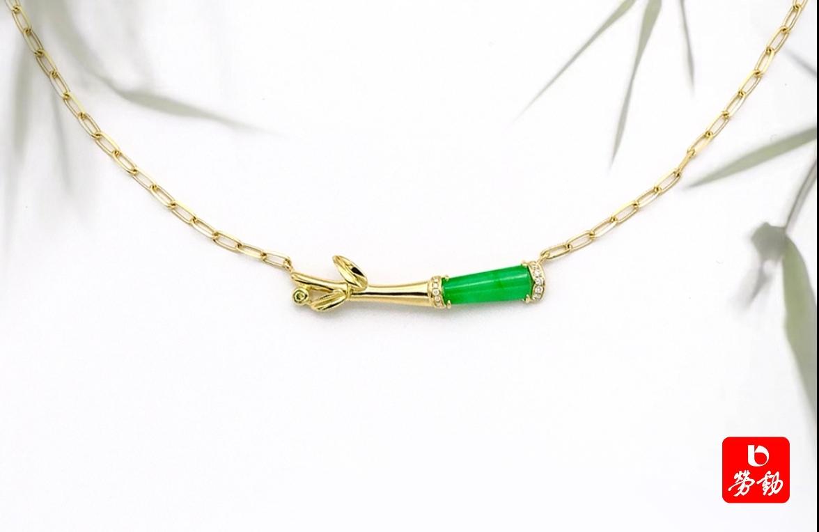 老凤祥另一款以翡翠竹节为主体的锁骨链把文人雅趣和时尚审美融为一体,更有新意。整条项链以翡翠竹节为主体,18K金的竹尖和竹叶以及钻石点缀的露水,仿佛嫩笋破土而出,逐节上升,开枝发叶,象征“有志有节”。整个挂件又似一个简洁的“笑”脸上弯弯的嘴巴,简洁、大气,设计感满满,轻奢时尚,非常出彩。