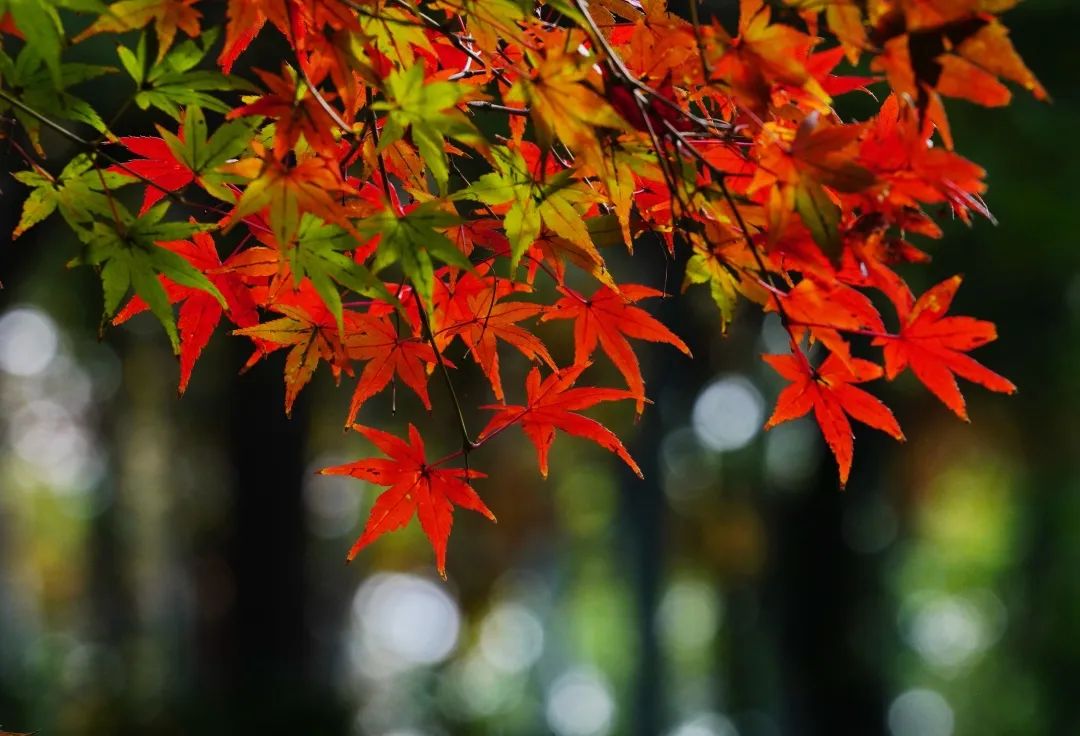 到了秋天,园中如打翻的调色盘,黄、橙、红、绿,让人眼花缭乱。