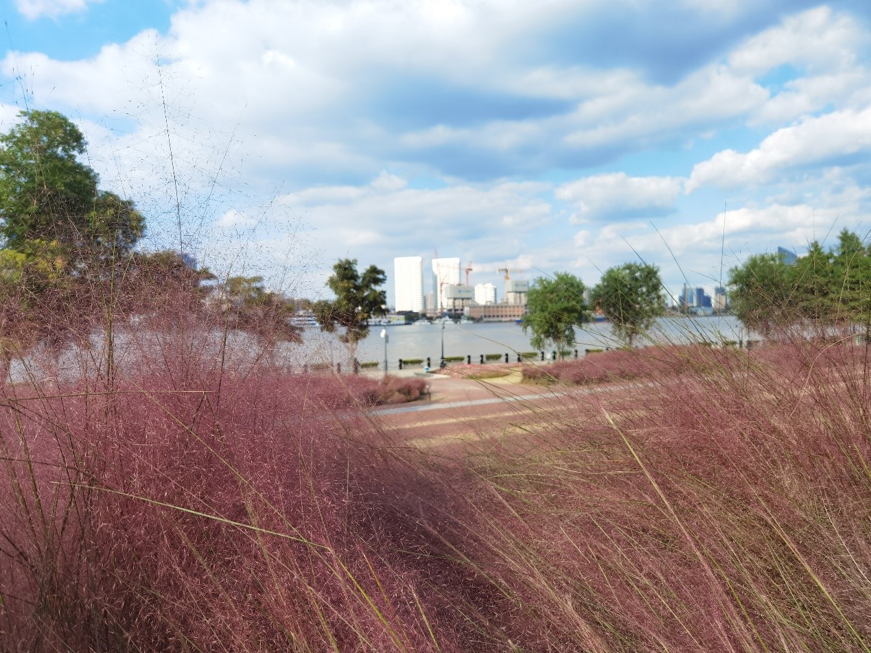 船厂1862附近的粉黛子种在商场前的阶梯两边,正对着黄浦江。黄浦江畔的粉黛子跟随江风轻轻摆动,衬着蓝天白云,别有一番风味。这里还设置了一些小心思,王女士看了社交平台上的分享后,非常心动,特地带着母亲一起来打卡,月亮型的装置为她们的粉黛子大片增添了更多亮点。