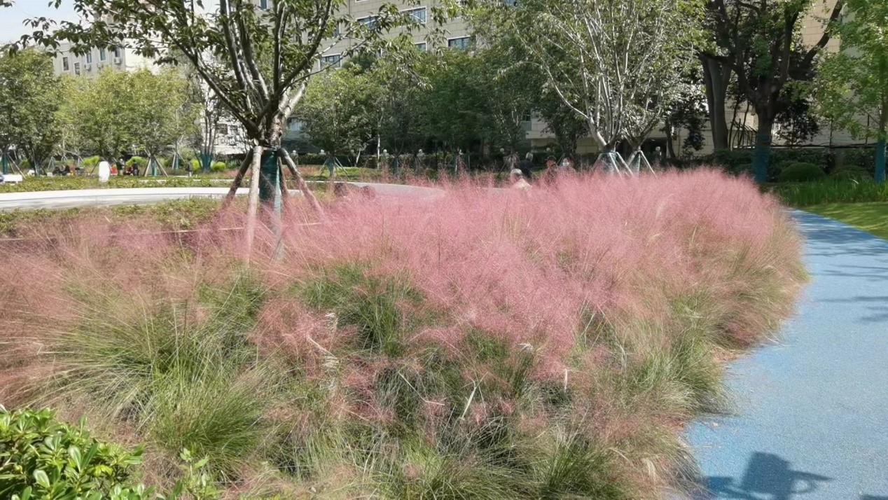 此外,留意身边的景致也可能带来惊喜,一场不期而遇的美好也别有意趣。乐山口袋公园,是社区中家喻户晓的休闲地。“又种起来啦,蛮漂亮的!”“这里一直有的!”推着婴儿车的女士与父亲看着近处的粉黛子闲聊着。蹲下来拍、站起身俯拍,一旁拿着手机的李女士对着粉黛子不断尝试角度。家门口的粉黛乱子草虽然没有形成粉红花海,但是却在郁郁葱葱的包裹中,点缀着绿地的活力。在花丛与树木之间的道路上漫步或是晨跑、夜跑时穿行而过,为这个秋日的生活添上一抹不一样的色彩。