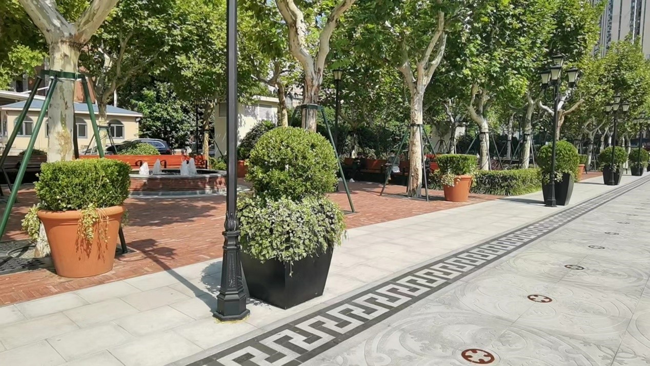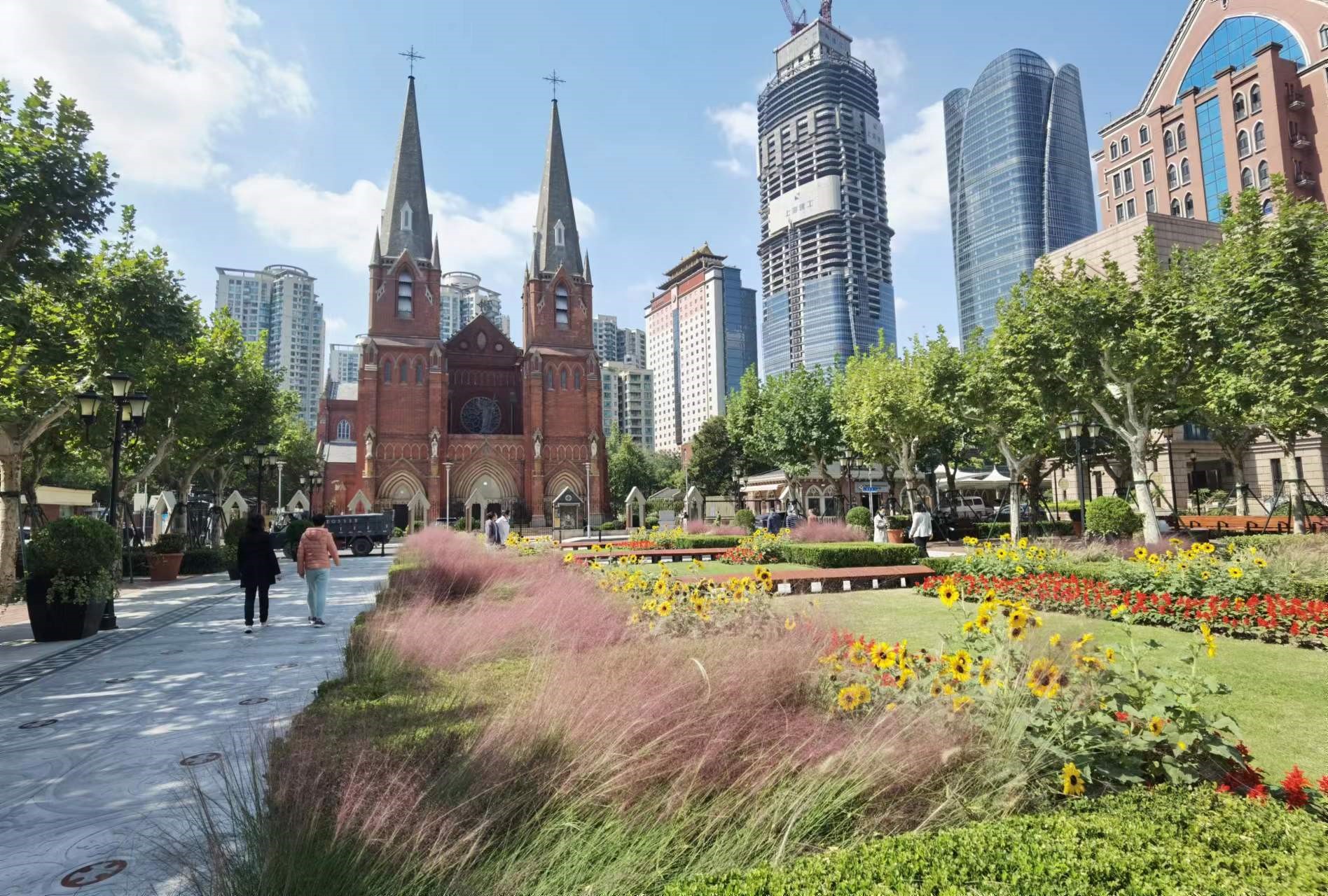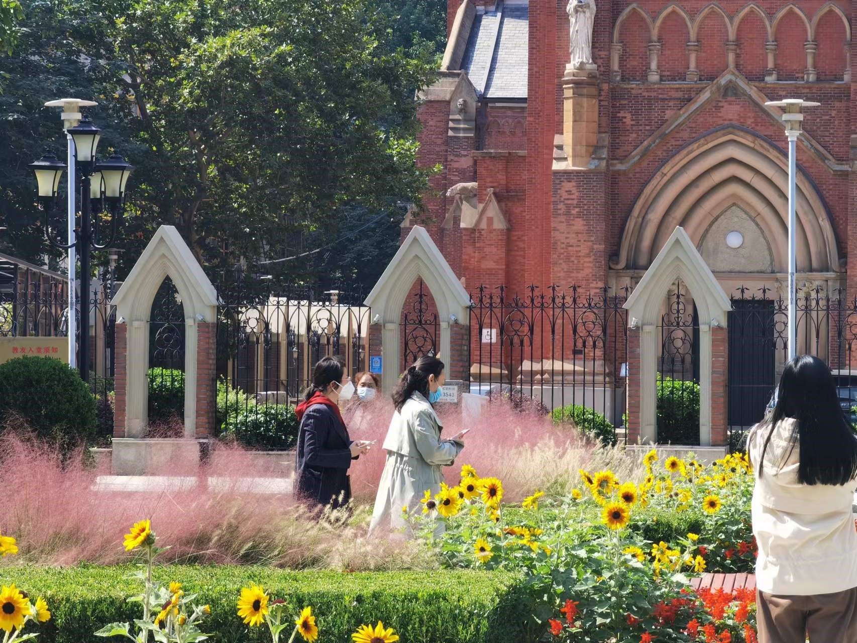 明媚的阳光下,一串红、向日葵、粉黛子相映成趣,在教堂前的广场绿化带两边对称分布。道路两旁树木形成的绿荫大道外,有专门给行人休息、可以坐上一坐的地方,还有喷泉点缀其中。这里不仅为附近的上班族提供了午间散步的好去处,还吸引了不少游客特地前来打卡。