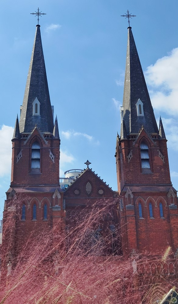 始建于1904年,矗立于徐家汇的圣依纳爵主教座堂已拥有超百年的历史。源于中世纪哥特式建筑风格的教堂透露着神秘而浪漫的气息,尖肋拱顶的结构让教堂的尖塔具有不断向上延伸的动势,仿佛要触及天空。在这座百年建筑前,可以找到粉黛子的身影。