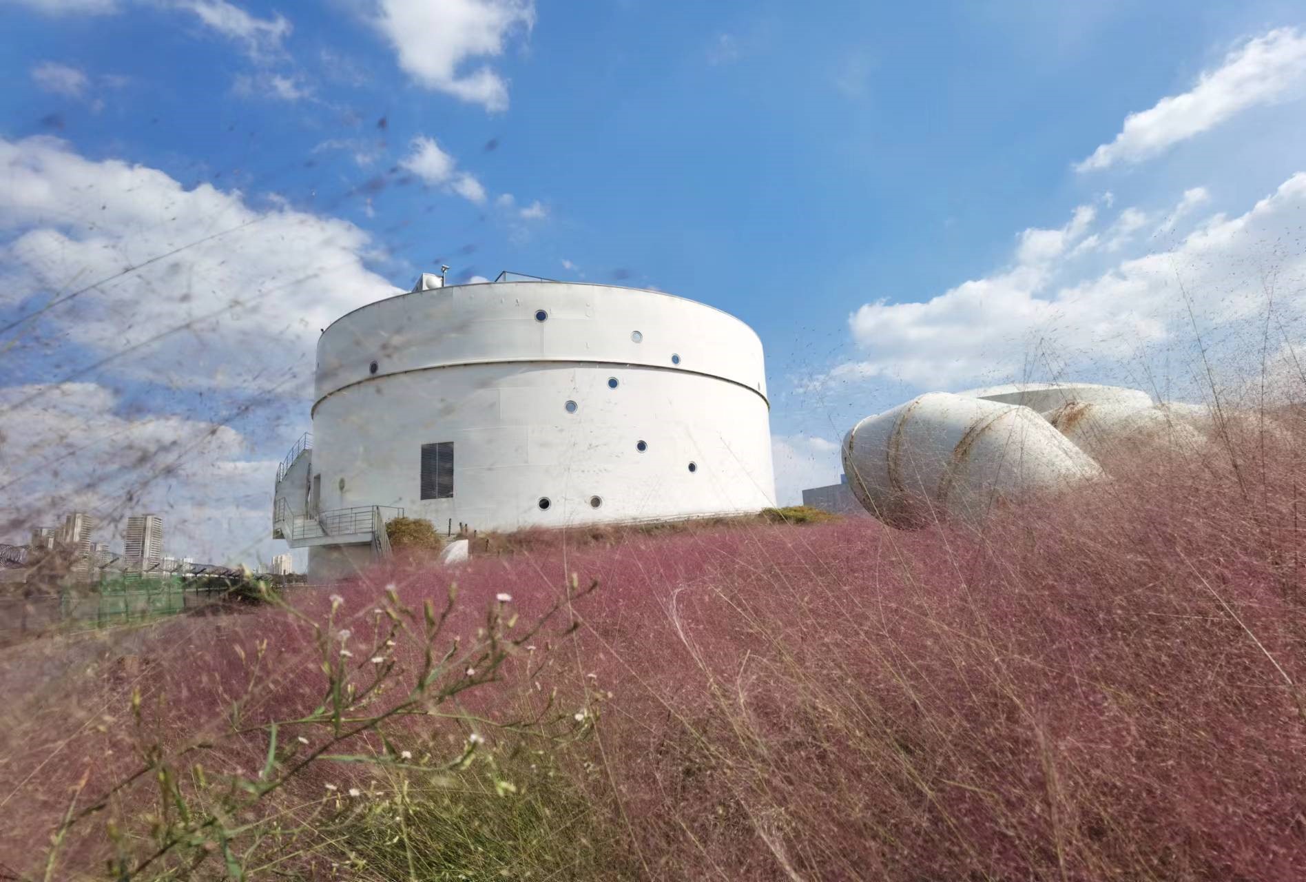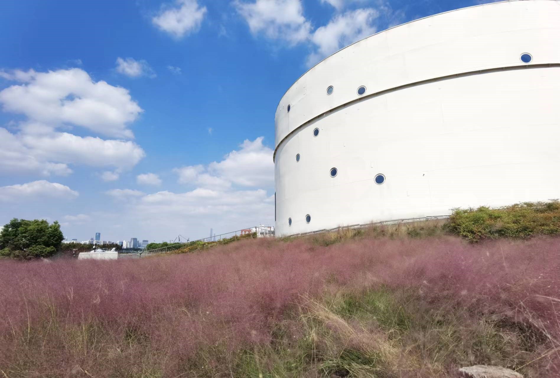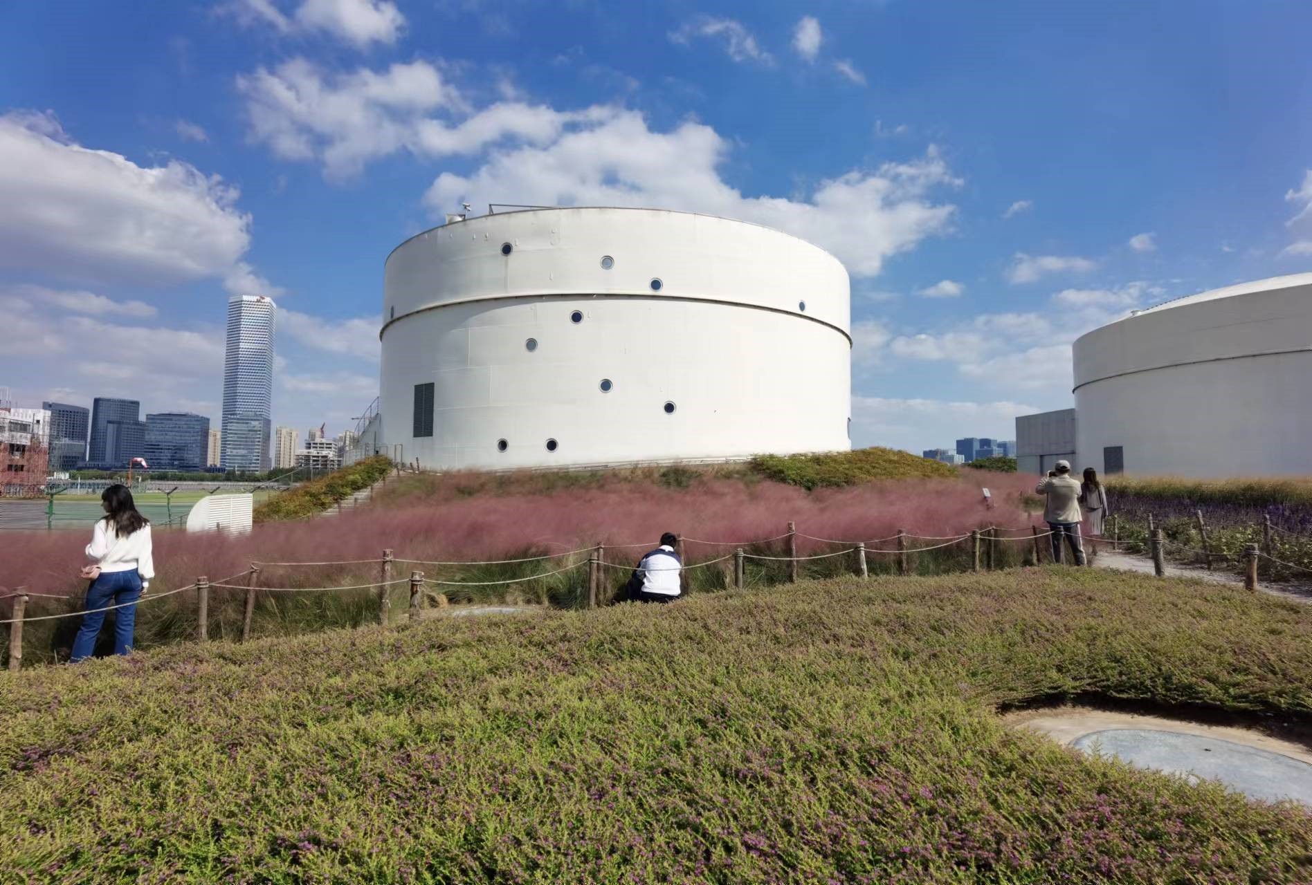 昔日服务于上海龙华机场的航油罐,如今正在成为西岸的新地标。植物环绕中的油罐以洁净的白色和澄净的天空遥相呼应。沿着入口处的小道向里走,粉黛子花海映入眼帘,工作日的午后也有不少人在这里打卡,尤其以情侣居多。还有人有备而来,带上了专业摄影师。