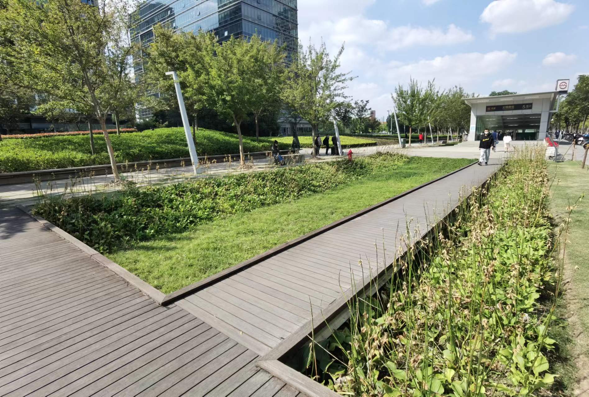 收集了徐家汇天主教堂前的粉黛子,下一站我们将去往西岸,那里的粉黛子将会在油罐艺术公园附近出没。在徐家汇站乘坐地铁11号线,三站即可达到云锦路,从5号口出来,有个街边花园出现在眼前,木栈道上走一走也很不错,接着步行不远的距离就能到达目的地。