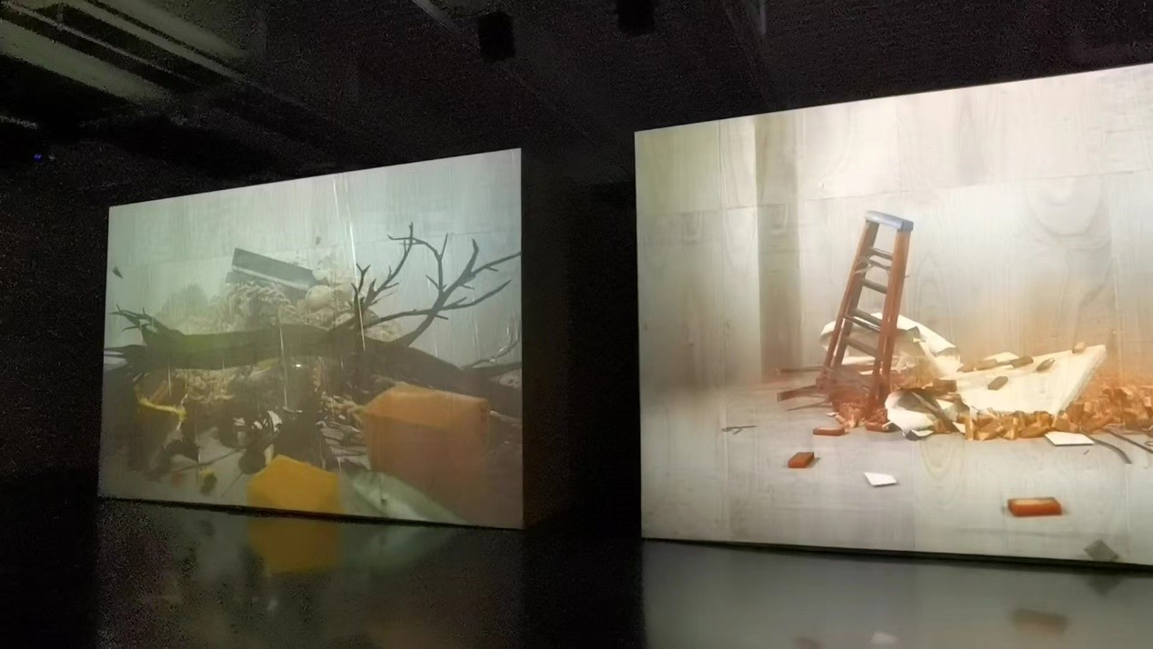 低头拍摄间,一个男生滑着滑板与笔者擦肩而过,从工业锈带到生活秀带,活力西岸让人们能够用不同的方式丈量自己对西岸的理解。如果来打卡粉黛子的你恰巧对艺术颇有兴趣,不妨看一看油罐艺术中心正在举办的展览。现在,由埃德·阿特金斯带来的名为“无用之物”的展览正在展出。展览的主要部分由四个巨大木箱组成,它们占据了展厅的一二两层,每层各有两个。可以将木箱认为是投影布,埃德·阿特金斯想要呈现的内容就投影在木箱上。他运用计算机技术,使得电脑随机生成物品,这些物品向下坠落,在触底时发出巨大的响声,画面同时会跟着声音震动,床架、钢琴,乃至是植物、动物、人类,都会随机出现在画面中,此时作为幕布的木箱表面犹如一个巨大的废弃箱,展厅周围的墙壁上还挂着由纷繁线条组成的作品。