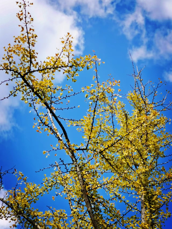 秋季最美的,就是颜色。为了突出金黄色的主色调,可以选用与金黄色互补的颜色来突出黄色的视觉效果,例如将蓝天作为背景。