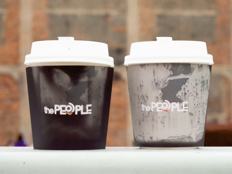 当你拿起一杯热热的咖啡,特质杯套在遇热后,会慢慢浮现出四行仓库那满是弹孔的墙面,上面印着“这盛世如您所愿”“为人民服务”等语句,一杯咖啡也被注入了深厚的爱国情怀,让人无比感动。