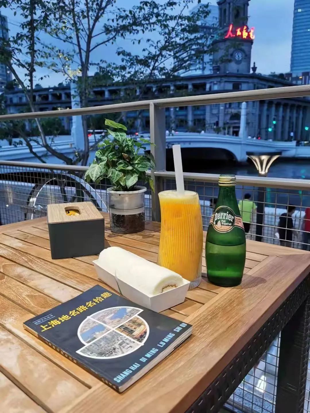 店内设有滨河露台位,隔岸耸立着上海邮政博物馆和苏宁宝丽嘉酒店,历史建筑和新潮地标交相辉映。河水静静流淌,连时间都是懒洋洋的。