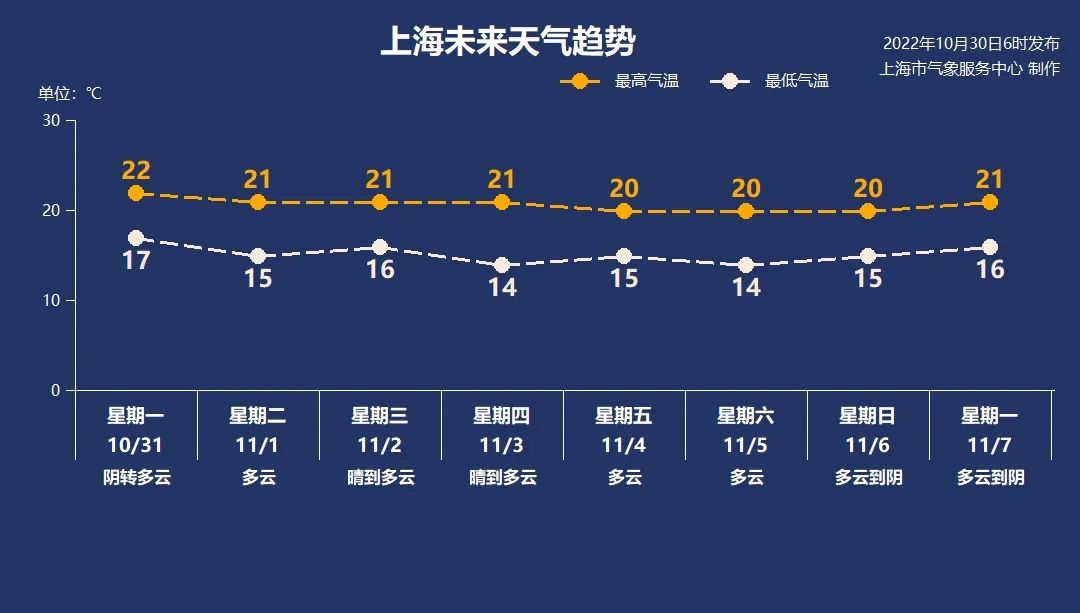 本周申城主打秋高气爽的好天气,没有雨水打扰,只有秋云时疏时密,每日变幻。气温继续在舒适范围内波动,最高气温19-21℃,最低气温14-16℃,早晚体感偏凉,注意添衣保暖,秋季干燥明显,补水润燥不可少。