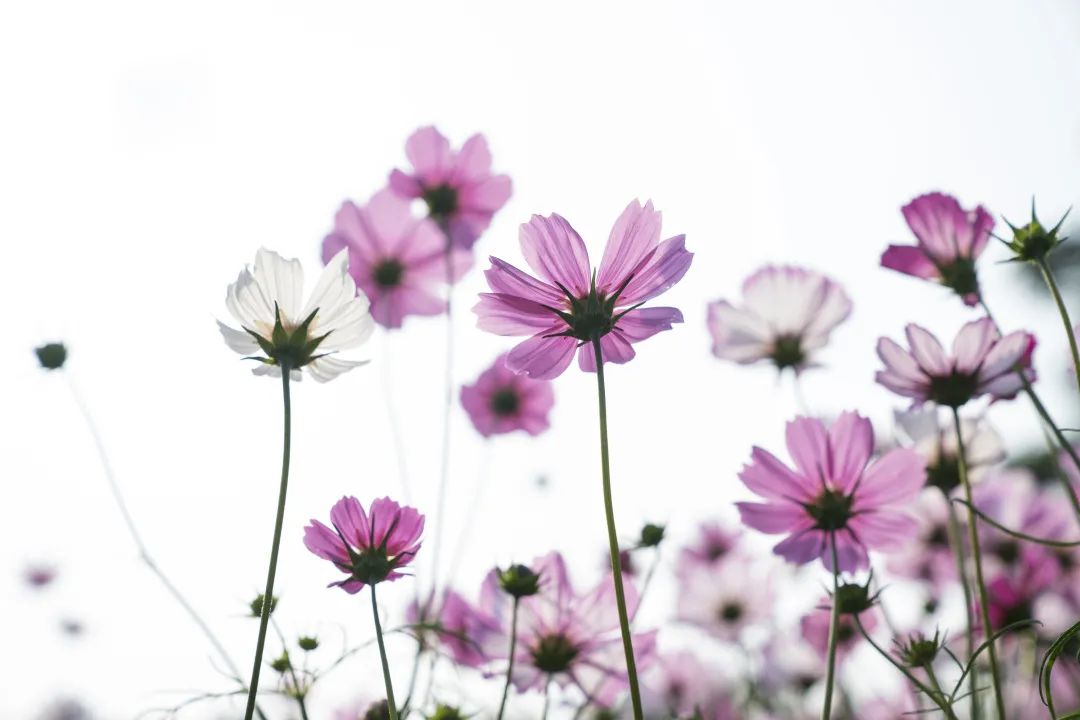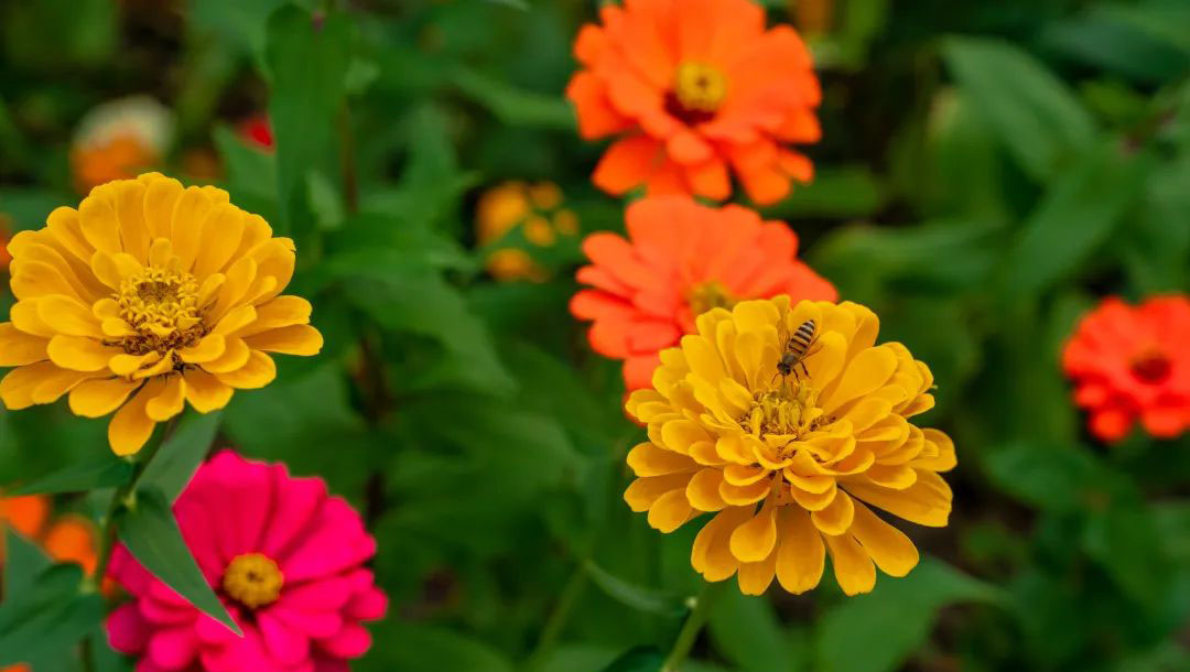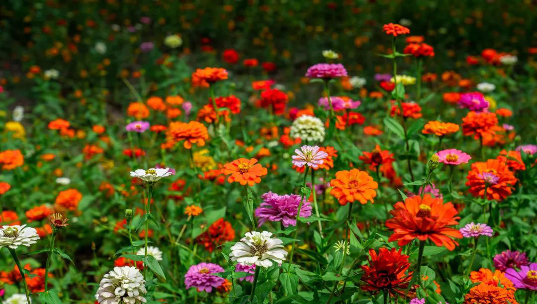 百日草又叫百日菊,为菊科植物的一种,花期很长,有紫、红、橘等多种颜色。更有趣的是,它的第一朵花开在花枝的顶端,侧枝开花会比第一朵开得更高,紧追慢赶,争奇斗艳。微风拂过,花儿摇曳着身姿,艳丽与清纯并存,热情和恬淡共舞。远远望去,仿佛波涛起伏、色彩交错的海浪翻滚,又如翩翩少女组成的合唱队在为秋天歌唱。