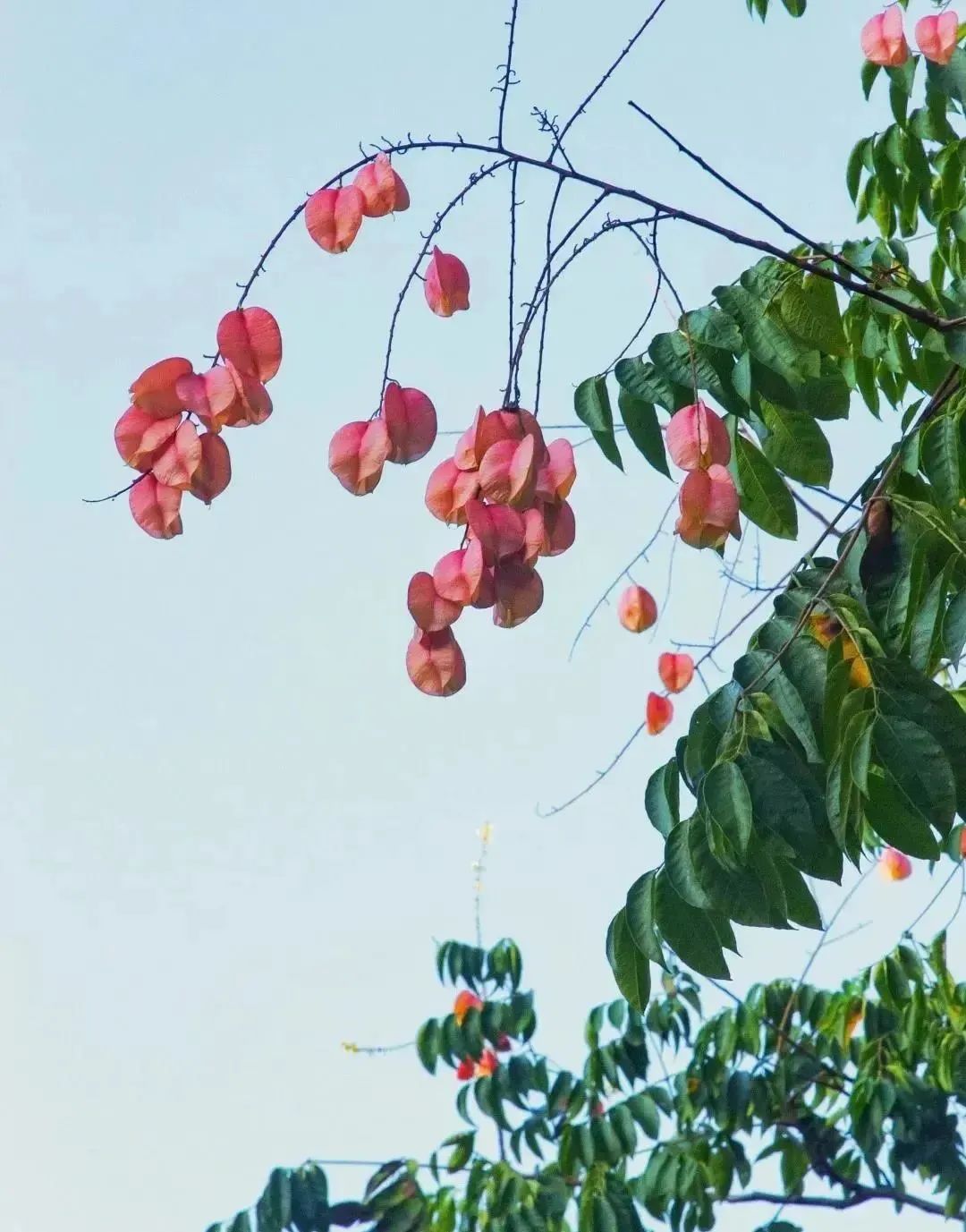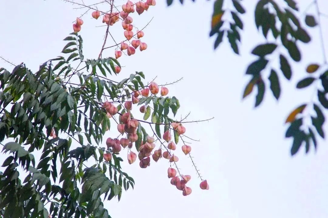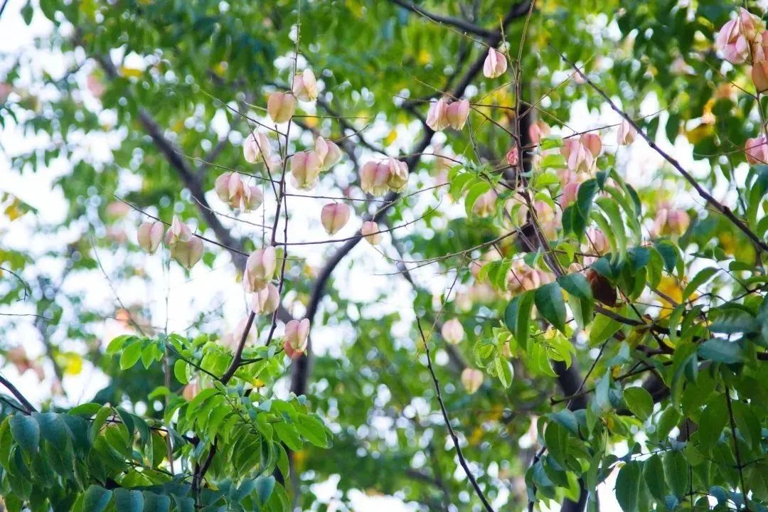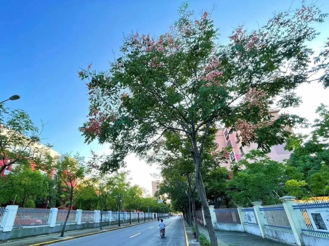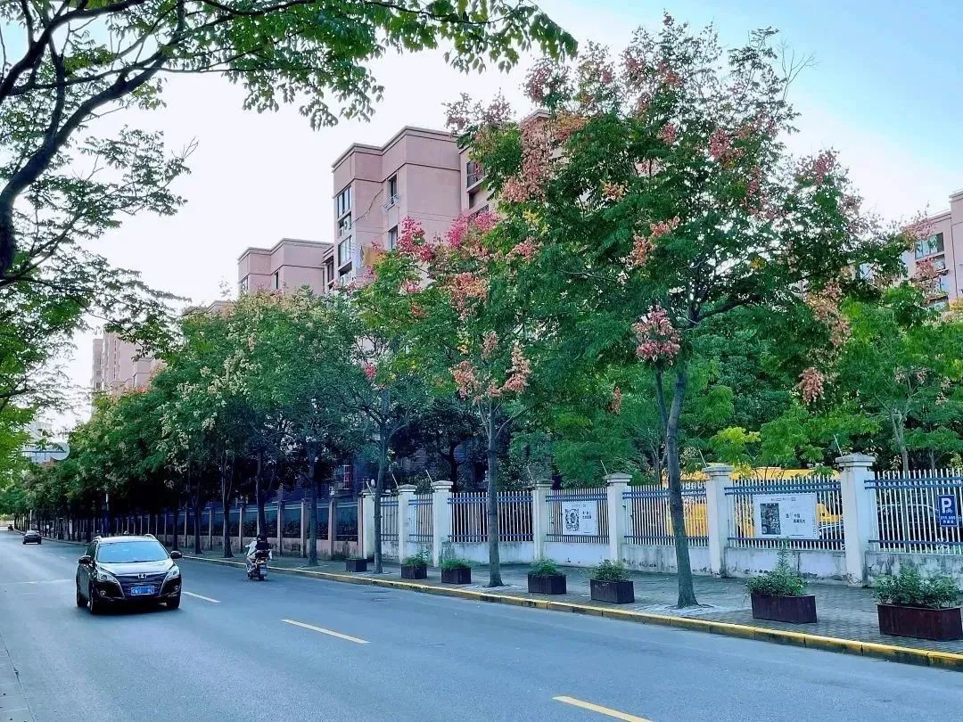 闵驰二路道旁,一棵棵栾树树干挺直,树冠圆润。金黄色的花朵,密密麻麻布满枝头,细细的、小小的花散发着淡淡的花香 。一大片金黄色层层叠叠,黄绿中泛着红,花果共荣,为这个清爽的季节,