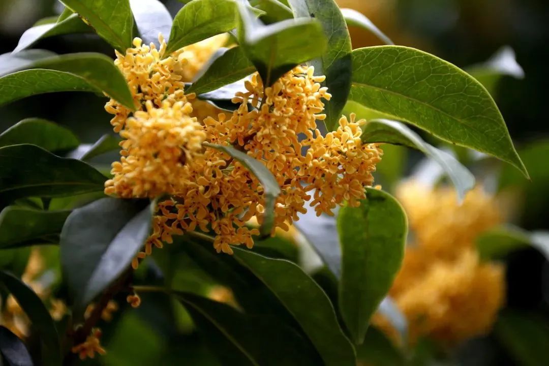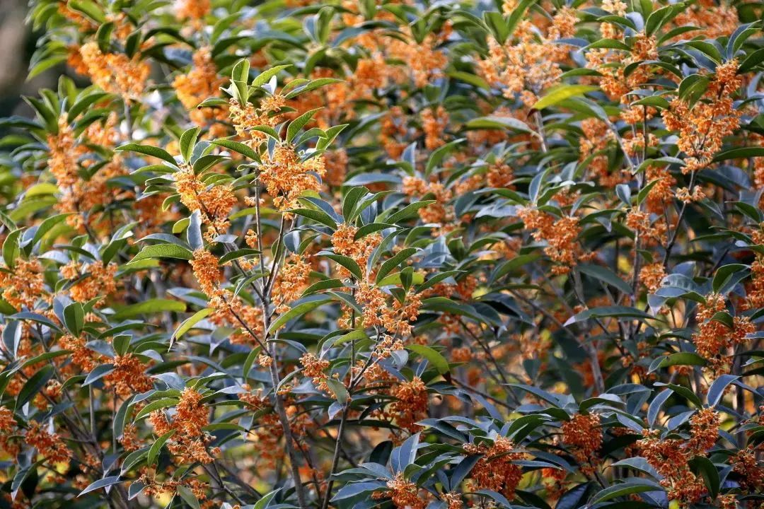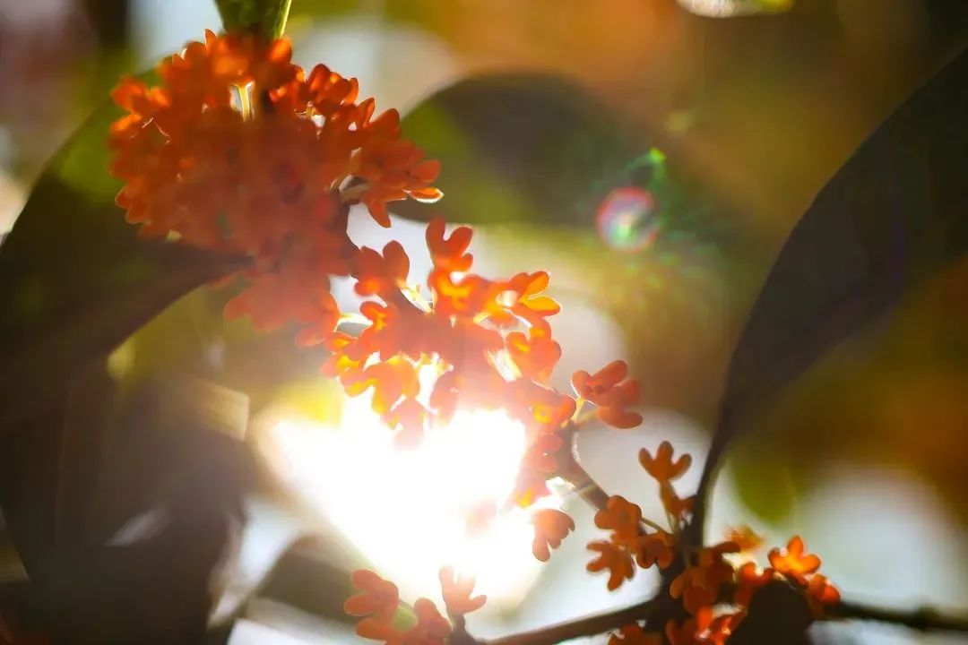 金黄色、黄白色、橙红色,细细碎碎的桂花,在枝丫分叉处,一团团一簇簇地聚在一起。四瓣花瓣的小小花朵,散发着沁人心脾的幽香,它用自己的香气,吸引了行人驻足,让人沉浸其中,忍不住深吸几口。