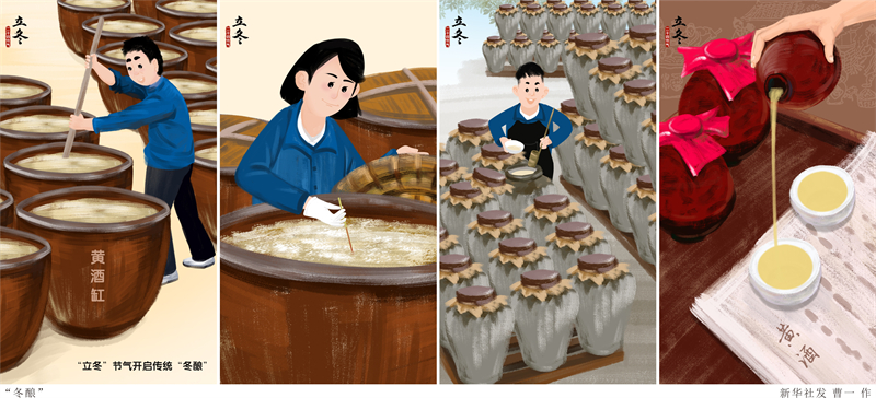 立冬之日开始酿黄酒,是绍兴传统的酿酒风俗。选择立冬这一天开酿黄酒是有讲究的。立冬后,水体清冽、气温降低,不仅可有效地抑制杂菌繁殖,保证发酵顺利进行,还能使酒在长时间低温发酵过程中形成良好的风味。从立冬到立春这大约120天的时间里,最适合酿制黄酒,当地人称之为“冬酿”。绍兴人有一句土话叫作“儿子要亲生,老酒要冬酿”,“冬酿”习俗可见一斑。