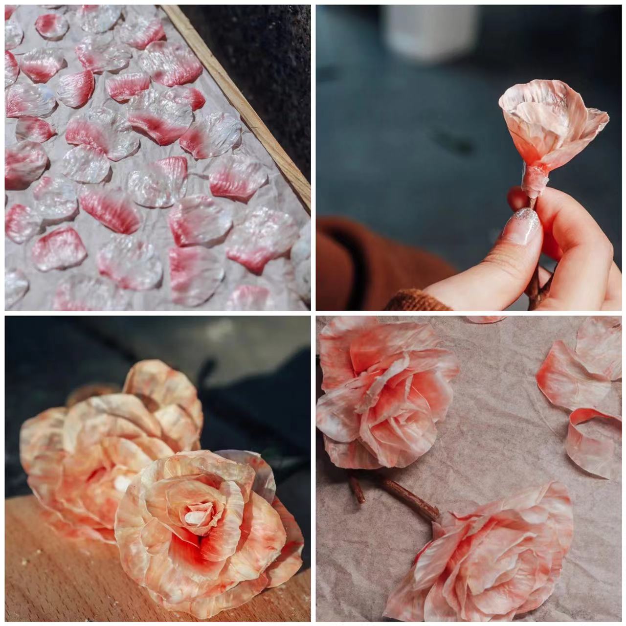 柚子肉的皮也能玩出浪漫的花样,把果肉皮撕下来后剪成花瓣的样子,放到太阳底下晒两个小时,再捡一根掉落的树枝,在树枝头部缠上双面胶,将花瓣按次序一圈一圈往上粘即可。与新鲜的花不同,淡粉色渐变的柚子味玫瑰,自带微枯复古的美感。