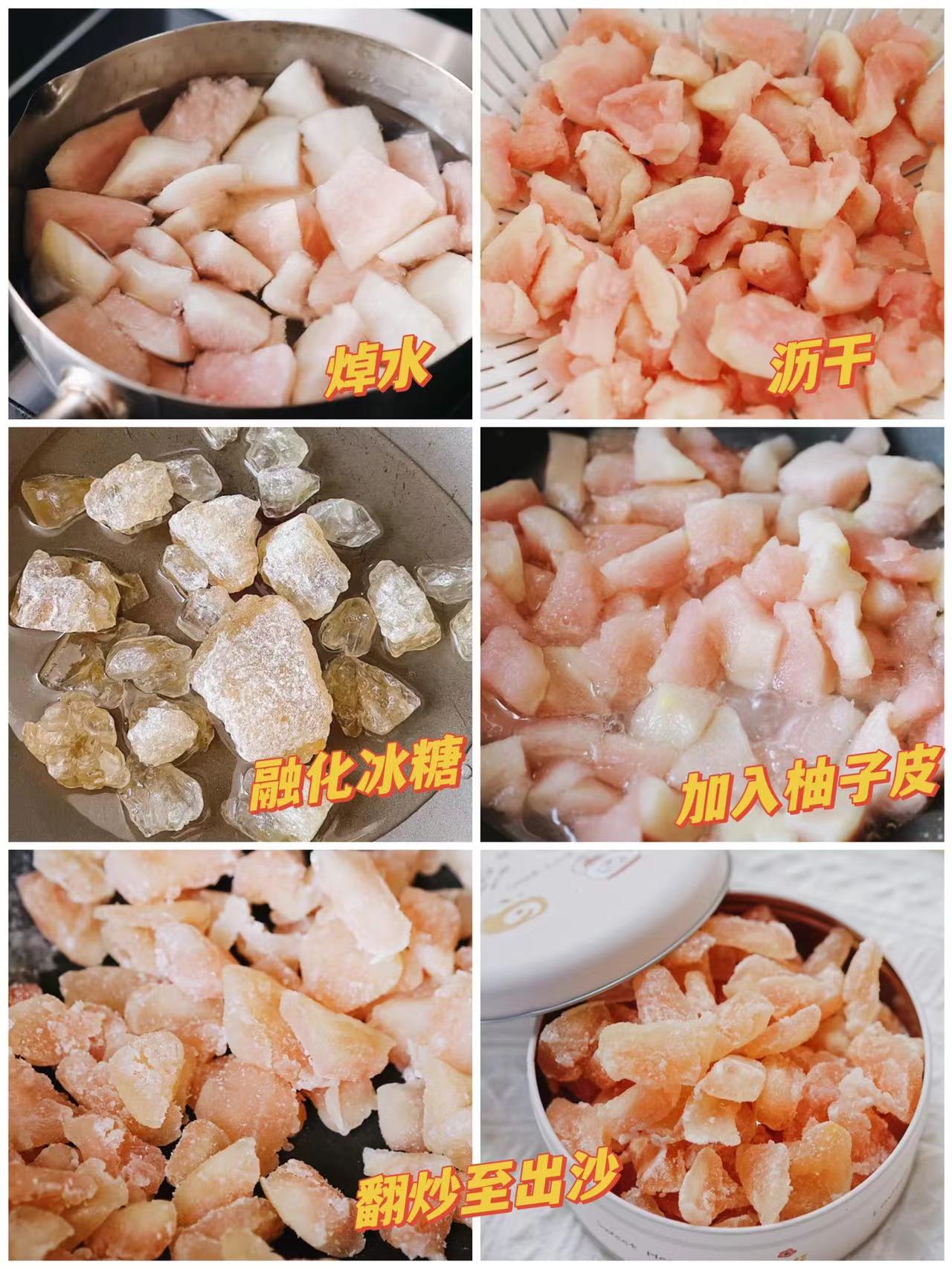 锅里放一小碗清水,融化200g冰糖。冰糖融化后放入100g白砂糖继续融化后,倒入拧干水的柚子皮开始进行翻炒挤压。
