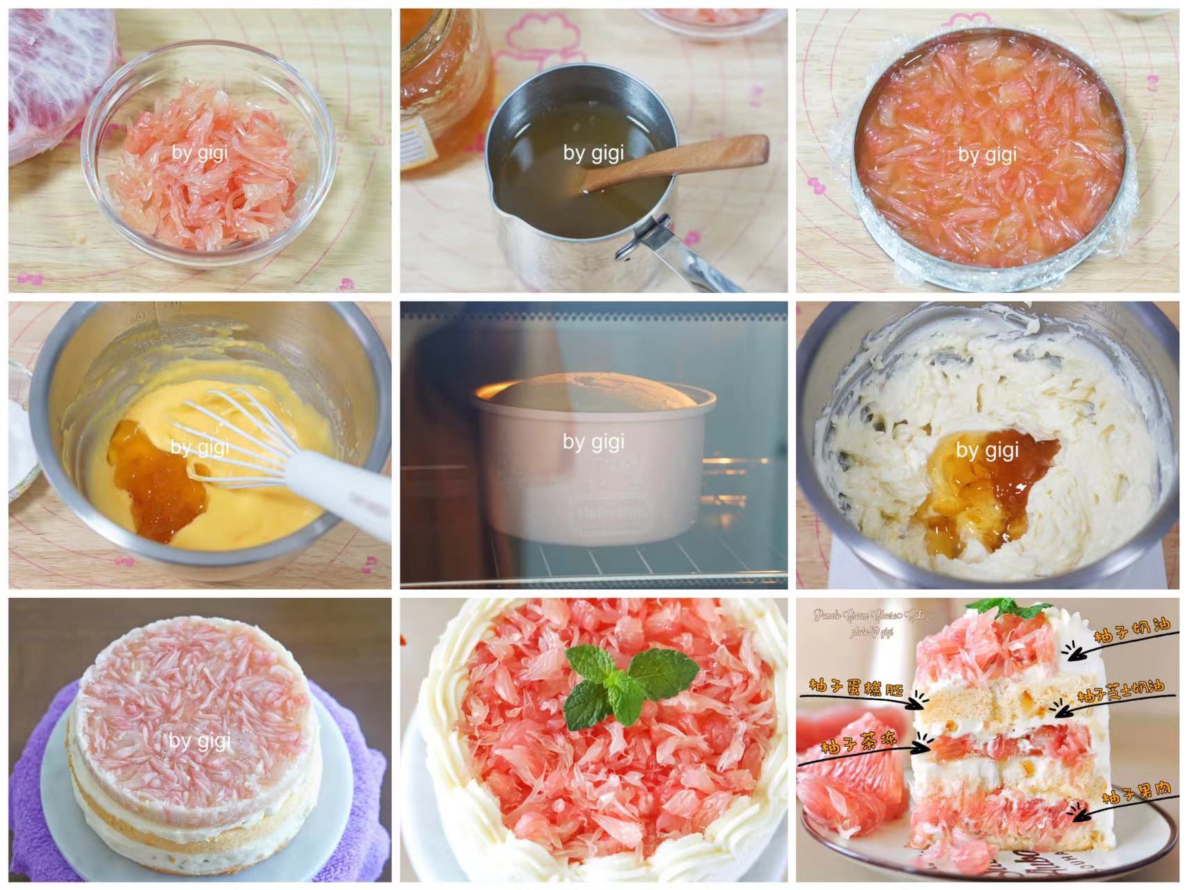 组装:蛋糕+奶油+柚子肉+蛋糕+奶油+柚子茶冻+奶油+蛋糕