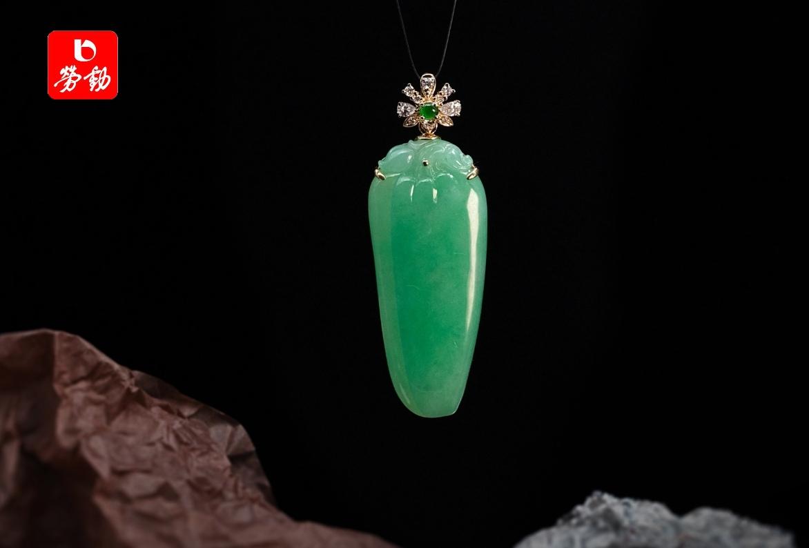除了运用古典元素外,扣头“光芒四射”的造型、金银两色K金与钻石、沙弗莱镶嵌搭配非常“点睛”,花卉造型融入翡翠挂件头部,让以“福瓜、祥云”为主体的挂件更多含义:稍纵即逝的绽放花卉,被精湛的技艺“定型”,在珠宝上彰显永恒之美。