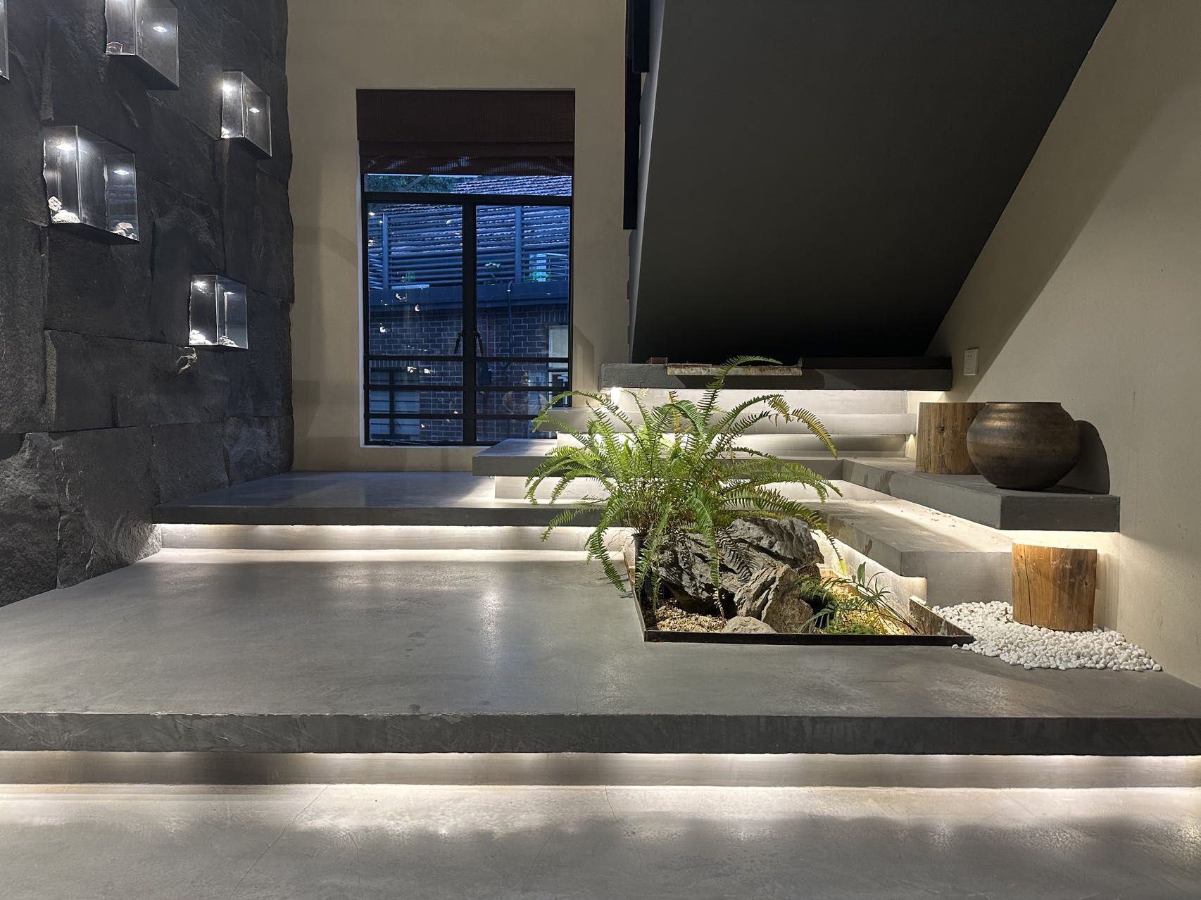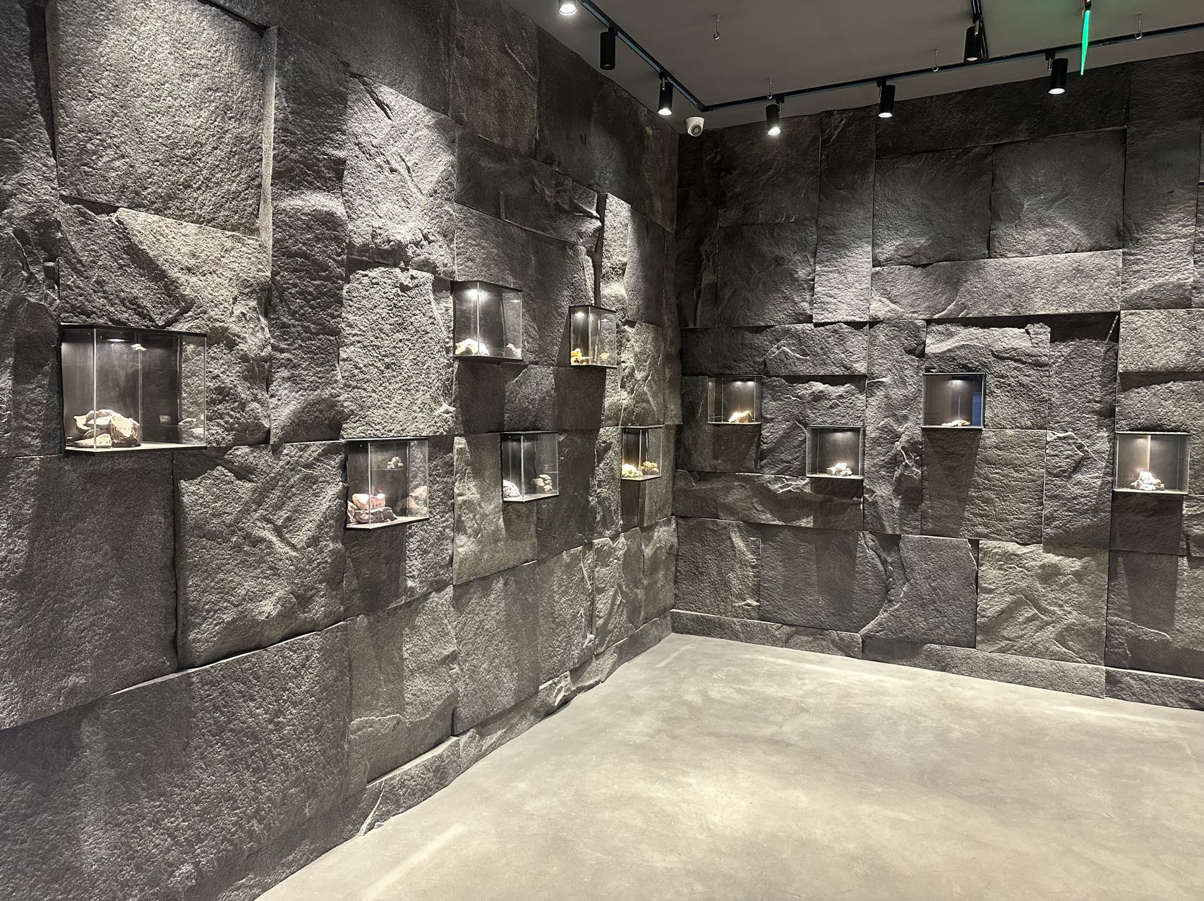 这家茶室开在创邑Space园区内,其装修风格融合了传统中式设计和工业风,将古朴与时尚糅合得刚刚好。入内,发现一楼大厅并无茶座,正对着门口的两面墙由大型石块组成,墙上点缀着玻璃橱窗,展示着用于制作茶壶的各类矿土,如有来自黄龙山的小红泥、石红等等。