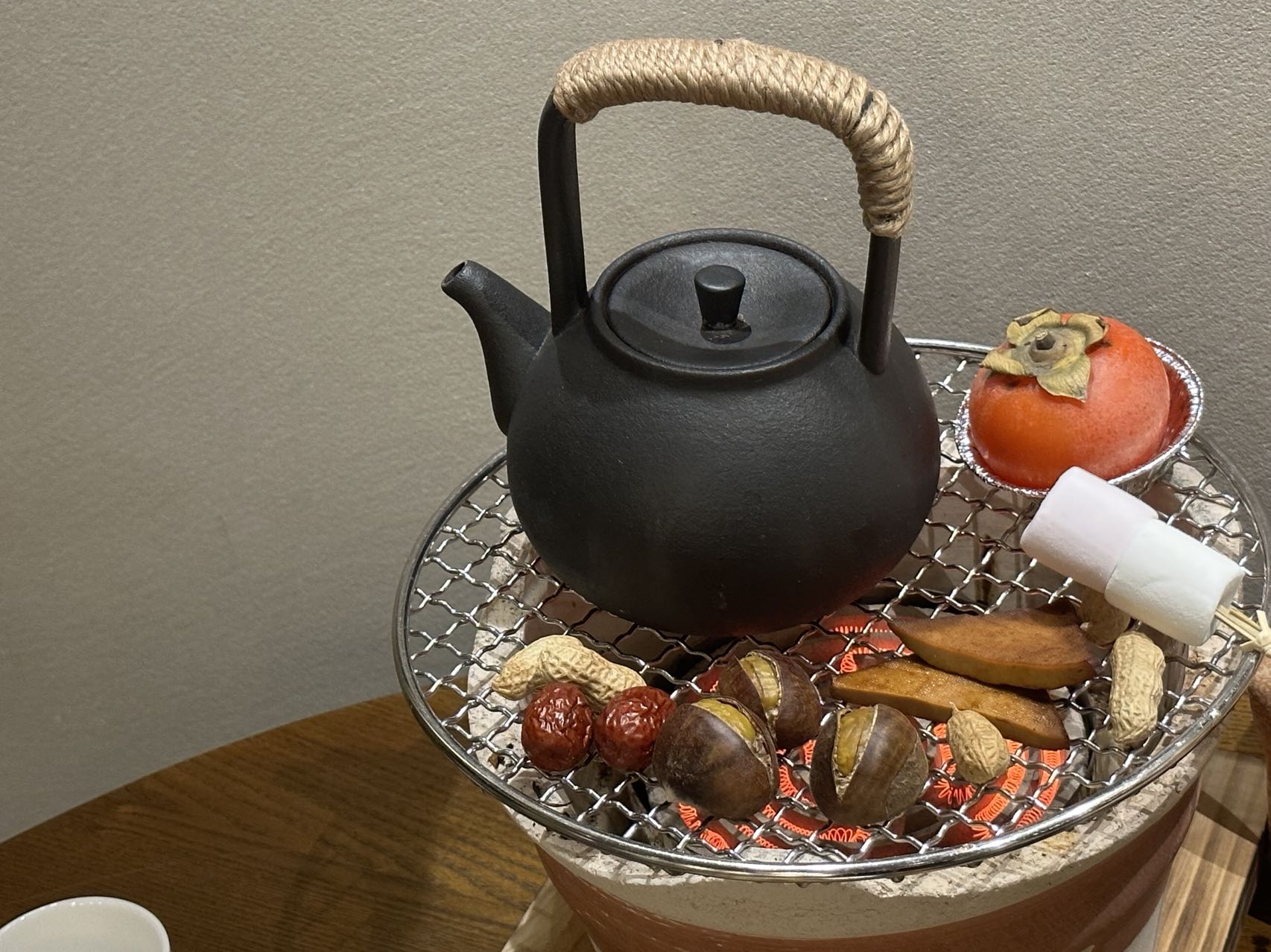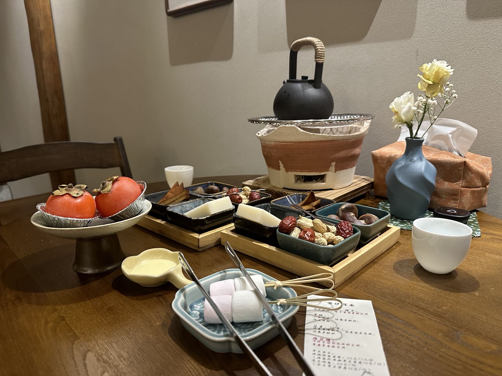 小坐一会儿,茶壶、茶点上桌。从工作人员那里了解到,烤物根据时令会有不同,现在主要有豆干、栗子、柿子、年糕、花生、红枣、棉花糖等。随餐上桌的还有一份围炉指南,食物怎么烤都有说明。另外,茶水免费可续,所有的茶都是现煮现泡。
