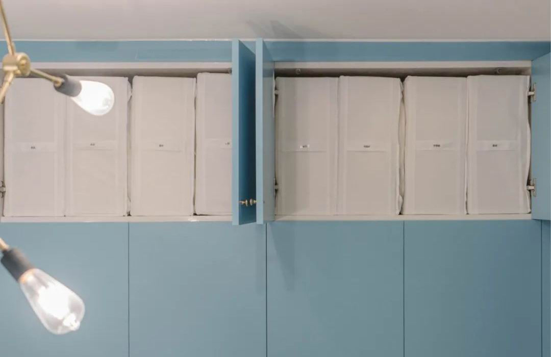 用标签分别收纳到不同收纳箱中,用到哪样拉出哪个箱子,不会把柜子弄乱。