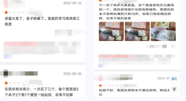 和其它盲盒商业模式一样,不少商家对于拆包后的文具盲盒同样不支持退换货服务。因此也带来一些售后问题,比如不少网友评价拆完盲盒发现里面产品做工粗糙,性价比很低,但却很难维权。