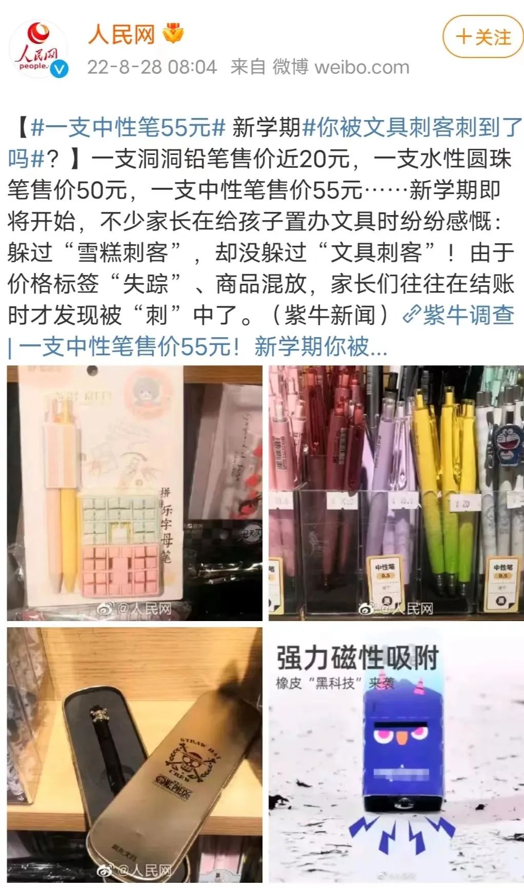 相比于传统简洁的文具产品,一些经过商家精心包装、设计的文具确实能够带来很强的视觉冲击和购买欲望,一些印有奥特曼、迪士尼、柯南等动漫人物的“联名款”文具,或是附带解压、免削、变形等“黑科技”文具,价格也在一路“升级”。前段时间“一只中性笔55元”登上热搜,也引发广大网友关注和热议。