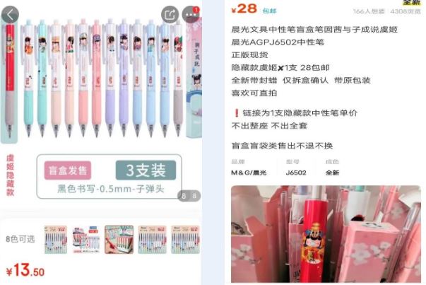 一些隐藏款文具在二级市场的价格更是严重溢价。比如晨光囡茜联名与子成说中性笔盲盒的价格在4至5元一支左右,但其隐藏款“虞姬”在某二手平台可以卖到28元,翻了近6倍。
