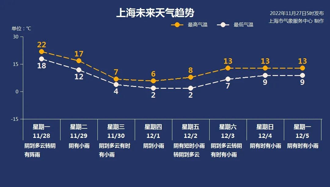 本周周初暖湿达鼎盛,11月29日中午起冷空气主体开始影响本市,气温明显下降,12月1日是此次寒潮影响下最冷的一天,市区最低气温2℃,郊区在零下1℃到零度之间,可能出现雨夹雪或小雪天气。