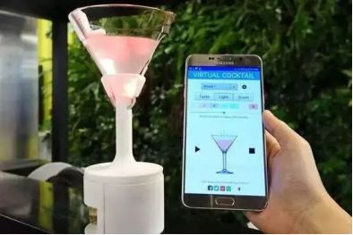 喝酒的人通过手机应用程序控制杯中液体的口味,味道可以改变、可以增强,最后骗过你的舌头和大脑。其实看起来五彩缤纷、喝起来也很够味儿的鸡尾酒,只是一杯白开水!