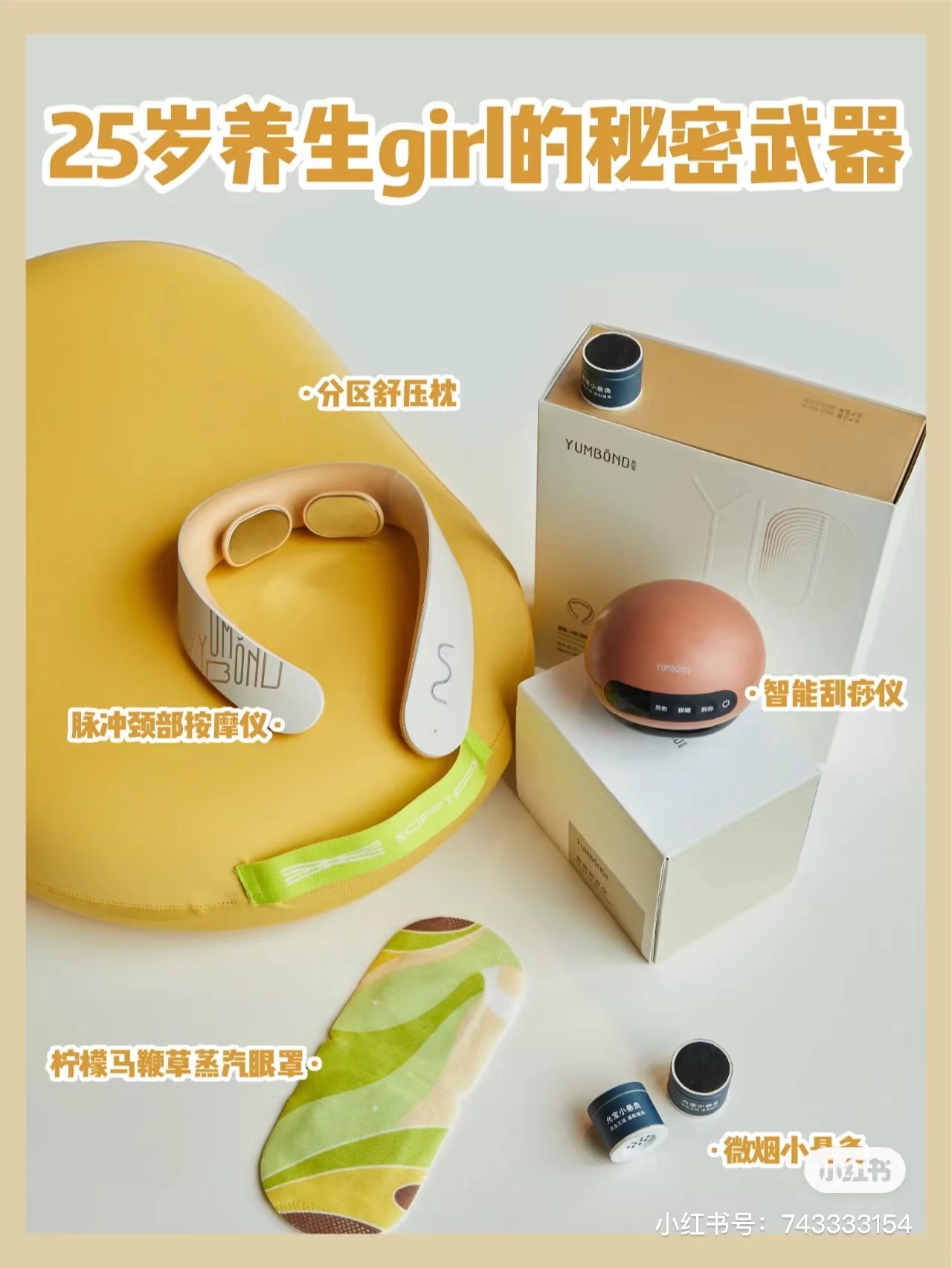 线下流行的年轻人必囤的养生五件套:舒压枕、脉冲颈部按摩仪、职能刮痧仪、微烟小艾灸、蒸汽眼罩。