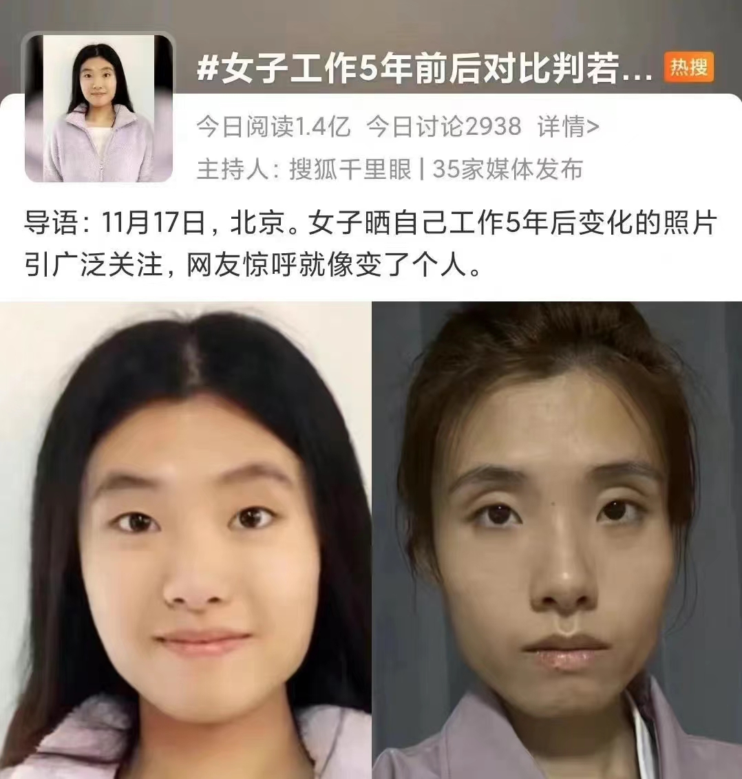 近日,一个“年轻女生晒出自己上班5年的颜值对比,堪比换头!”的帖子上了热搜,引发了众多网友尤其是年轻网友的共鸣。