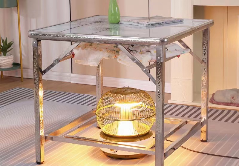 烤火桌其实就是电火炉加桌子加烤火被子的组合,桌架材质有木头的、竹子的,也有不锈钢的。