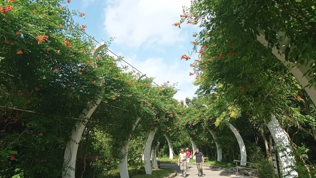 清涧公园以藤蔓植物为公园特色,其中有凌霄、紫藤、藤本月季、薜荔、鸡血藤、南蛇藤等17个植物品种,共计481株。大门的木香花架,旁边的薜荔、扶芳藤构成的绿墙,入口即凸显公园藤蔓特色。园内随处可见各类藤蔓植物区,春季日本紫藤梦幻流淌,夏季凌霄恣意绽放,春末夏初月季绚丽多彩,薜荔、扶芳藤、络石等植物的巧妙运用为公园增色添彩。观赏期自4月中下旬持续至10月中下旬。
